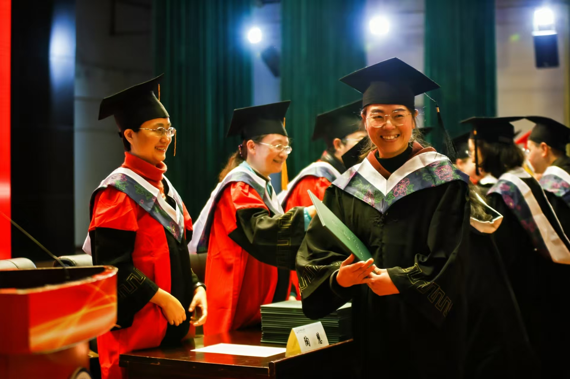 主席台就座的导师为参加毕业典礼的毕业生代表颁发毕业证书,并为获得学士学位的学生颁发学位证书、拨穗正冠。