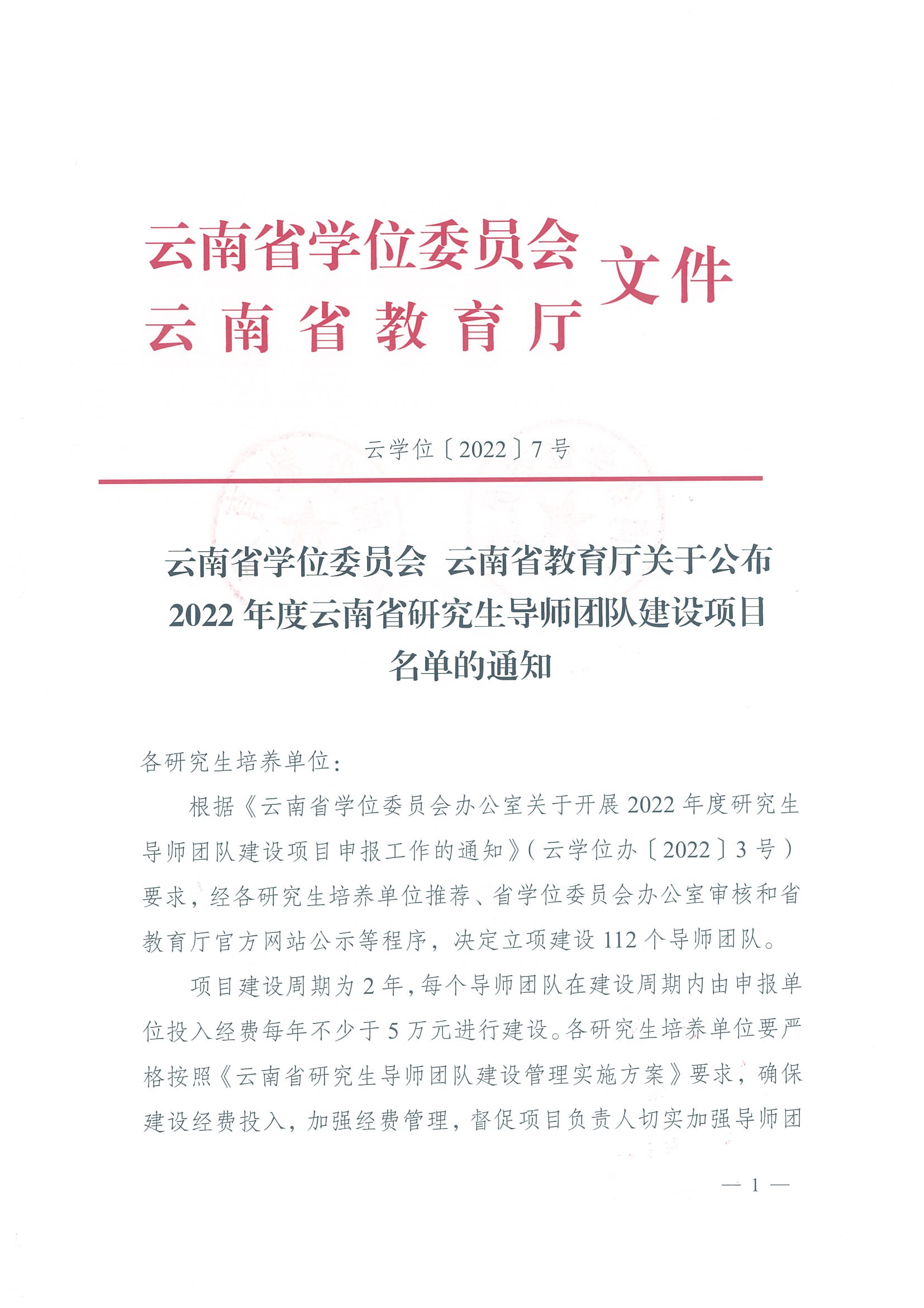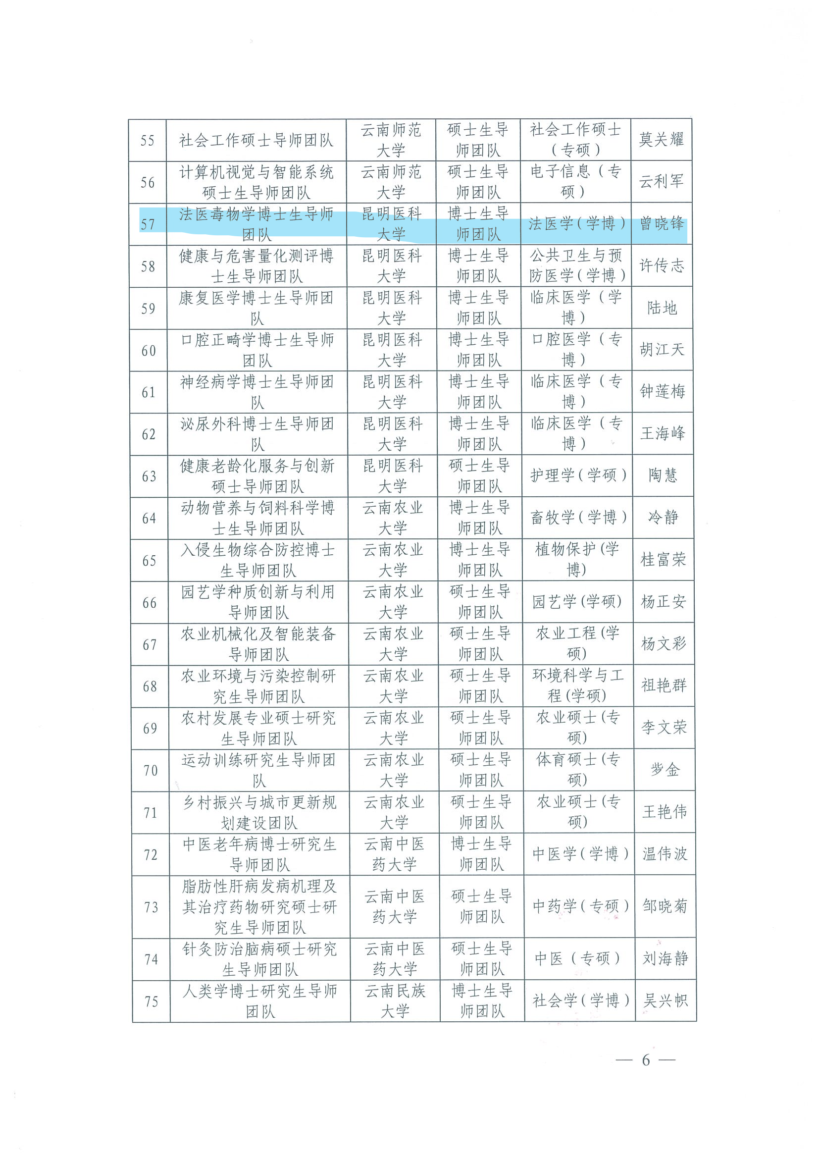 2022年9月1日,由云南省学位委员会、云南省教育厅联合发布的《云南省学位委员会 云南省教育厅关于公布2022年度云南省研究生导师团队建设项目名单的通知》(云学位〔2022〕7号)中,法医学院由曾晓锋教授所领衔的团队喜获“法医毒物学博士生导师团队”建设。