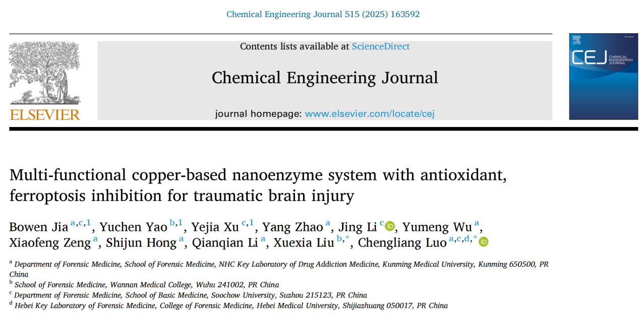 近日,米兰milan官方网站法医学院、国家卫生健康委员会毒品依赖和戒治重点实验室罗承良教授团队,联合皖南医学院法医学院刘雪霞副教授团队,以米兰milan官方网站为第一单位在期刊《Chemical Engineering Journal》(中科院1区Top,IF=13.4)发表题为《Multi-functional copper-based nanoenzyme system with antioxidant, ferroptosis inhibition for traumatic brain injury》的科研论文。罗承良教授和刘雪霞副教授为论文通讯作者,硕士研究生贾博雯、姚雨辰和徐烨佳为论文第一作者。该研究工作得到了国家自然科学基金、云南省科技厅基础研究计划重点项目等资助。