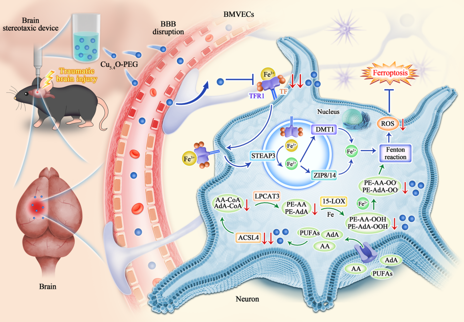 脑外伤(TBI)常伴有认知功能障碍的发生,其确切的分子调控机制尚不清楚,目前仍缺乏安全有效的治疗措施。为此,研究团队创新性地制备了一种具有良好的生物相容性和血脑屏障通透性的铜基纳米酶——聚乙二醇修饰的Cu5.4O(Cu5.4O-PEG)。经体内外实验证实Cu5.4O-PEG具有抗氧化与抗铁死亡作用,可减轻小鼠TBI引起的认知功能障碍。进一步发现,Cu5.4O-PEG改善TBI后认知功能,可通过抑制转铁蛋白受体1(TfR1)介导的铁死亡机制来实现。该研究为解析脑外伤后认知功能障碍的分子机制及其干预策略提供了新视角,为TBI认知功能评估与治疗提供了新思路。