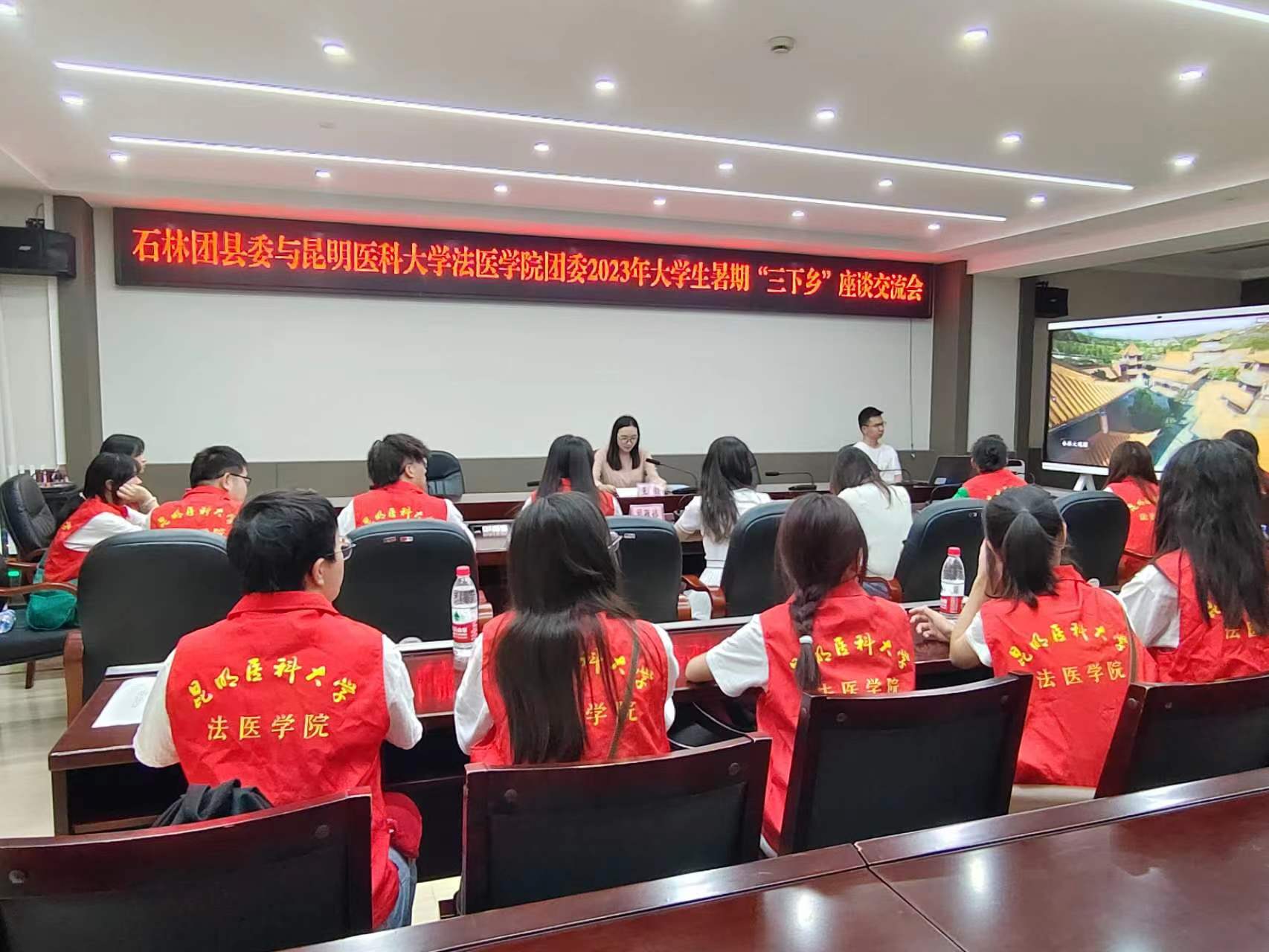 7月18日上午社会实践团队师生一行首先来到石林县行政中心与石林县团委开展了座谈交流。会上,法医学院团委书记申莹就近年来米兰milan官方网站法医学院结合专业特色开展法治助力乡村振兴社会实践活动的具体情况以及本次活动开展的目的意义等方面进行介绍;石林县团委书记王毅对社会实践团队师生一行表示热烈欢迎并围绕石林资源优势、民族文化、乡村振兴建设等方面向师生进行了详细介绍,座谈会上双方还就加强“校地合作”有效开展青年志愿服务工作、拓展高校社会实践活动的深度效度等方面进行深入座谈交流。