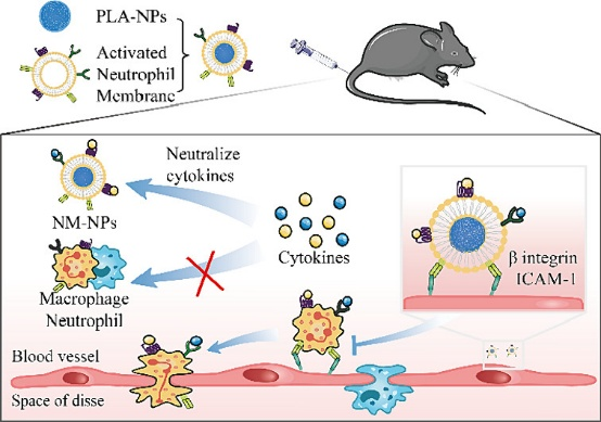 中性粒细胞膜包覆纳米粒子是一种具有模仿中性粒细胞表面特性和功能的纳米药物,中性粒细胞是人体中最丰富的白细胞类型,已被广泛用作针对各种炎症性疾病的靶向药物递送系统,但其本身作为载体材料对炎症的内在影响尚未完全表征。这项研究发现,中性粒细胞膜包覆纳米粒子其在无药物负载下,其自身可通过以下多种机制调节炎症:1)通过捕获趋化因子和阻断它们与炎症内皮细胞的粘附来抑制中性粒细胞和巨噬细胞向炎症部位的招募。2)中和炎症因子,减少炎症因子对细胞的损伤作用;3)被巨噬细胞和其他吞噬细胞内化后,通过磷脂酰丝氨酸改变它们的表型,并通过溶酶体降解和清除前序被中和的细胞因子和趋化因子。