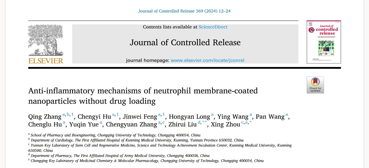 近日,药剂学旗舰期刊《Journal of Controlled Release》(中国科学院1区TOP期刊,IF=10.8)在线刊登了科技成果孵化中心引进人才周兴教授(创新细胞(器)治疗团队负责人)的最新研究成果。该论文题目为“Anti-inflammatory mechanisms of neutrophil membrane-coated nanoparticles without drug loading”,是对该团队于今年2月份发表于《ACS nano》(中国科学院1区、IF=17.1)上关于中性粒细胞膜修饰纳米粒抑制肿瘤转移作用工作的延续,详述了中性粒细胞膜修饰纳米粒的抗炎作用与机制。