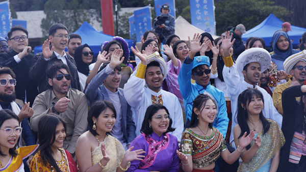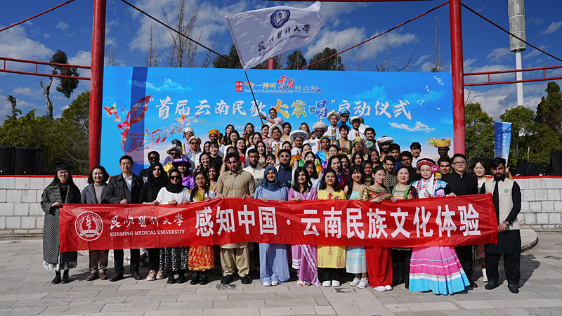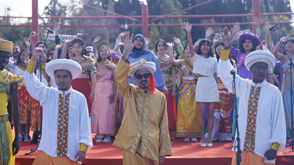 我校来自12个国家的中外师生穿着靓丽的各国传统服饰和各民族服装,在活动现场演唱了云南民歌《放马山歌》。他们清澈明亮的歌声、挥洒自如的舞蹈不仅展示了云南民歌的魅力,也让在座的观众体会到留学生对云南民歌别具一格的演绎,博得了现场热烈而持续的掌声与欢呼声,展现了我校学生健康阳光的良好形象。
