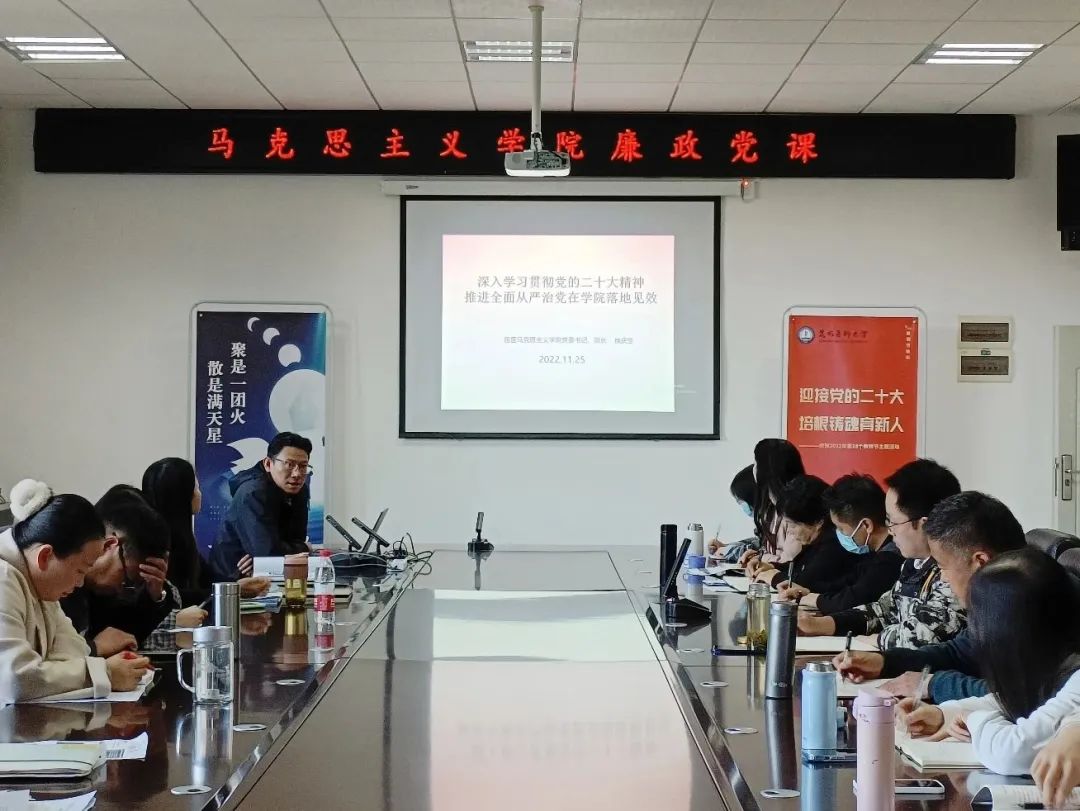 2022年11月25日下午,学院在209会议室进行党风廉政专题教育,学院党委书记、院长徐庆生主讲专题党课,全体教师参加了学习。