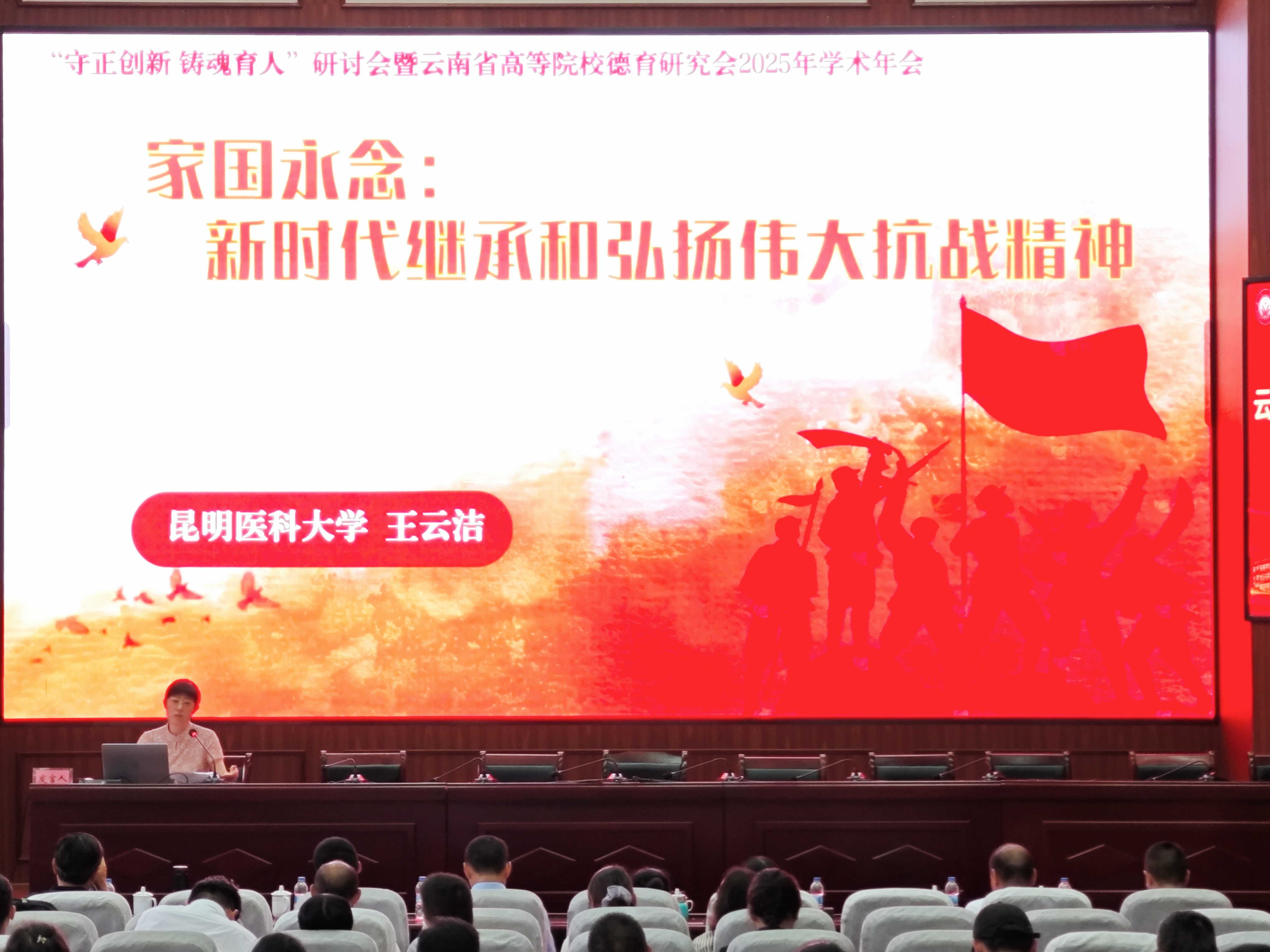 本次年会以“守正创新 铸魂育人”为主题,来自省内外5位与会专家作了主题报告。13所高校的领导、专家围绕“用习近平新时代中国特色社会主义思想铸魂育人的深刻内涵、精神实质和基本要求”“红色基因与时代楷模精神融入思政课实践教学的探索与实践”“以德为基、五育并举:守正创新育时代新人”“铸魂育人:新时代高校思政课若干思考”等议题展开深入研讨,分享各校德育工作的典型经验与创新成果。我院王云洁教授受邀作题为“家国永念:新时代继承和弘扬伟大抗战精神”的主题发言。她从滇西抗日英烈故事讲起,激励新时代要继承和弘扬伟大抗战精神,以精神之光照亮强国建设、民族复兴伟大征程,夺取具有许多新的历史特点的伟大斗争新胜利,书写历史伟业的壮丽新篇章。
