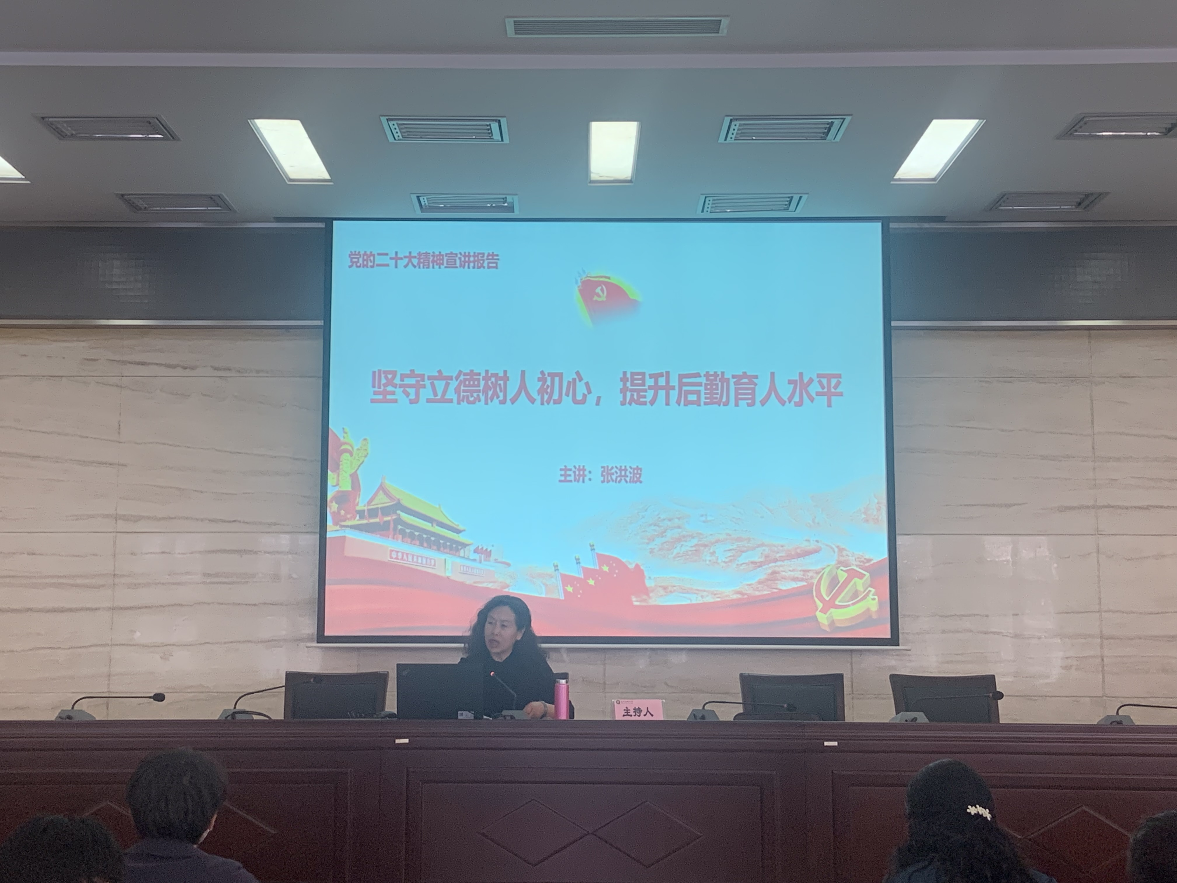 为全面深入学习领会党的二十大精神,扎实做好学习贯彻党的二十大精神宣讲工作,2023年3月17日,张洪波副校长以《坚守立德树人初心,提升后勤育人水平》为题,开展了党的二十大精神专题宣讲会。学校资产管理处、资产经营有限责任公司、校医院部分领导干部,后勤中心党政领导、党委委员、管理干部,党员代表、各部门办公室人员参加了宣讲会。