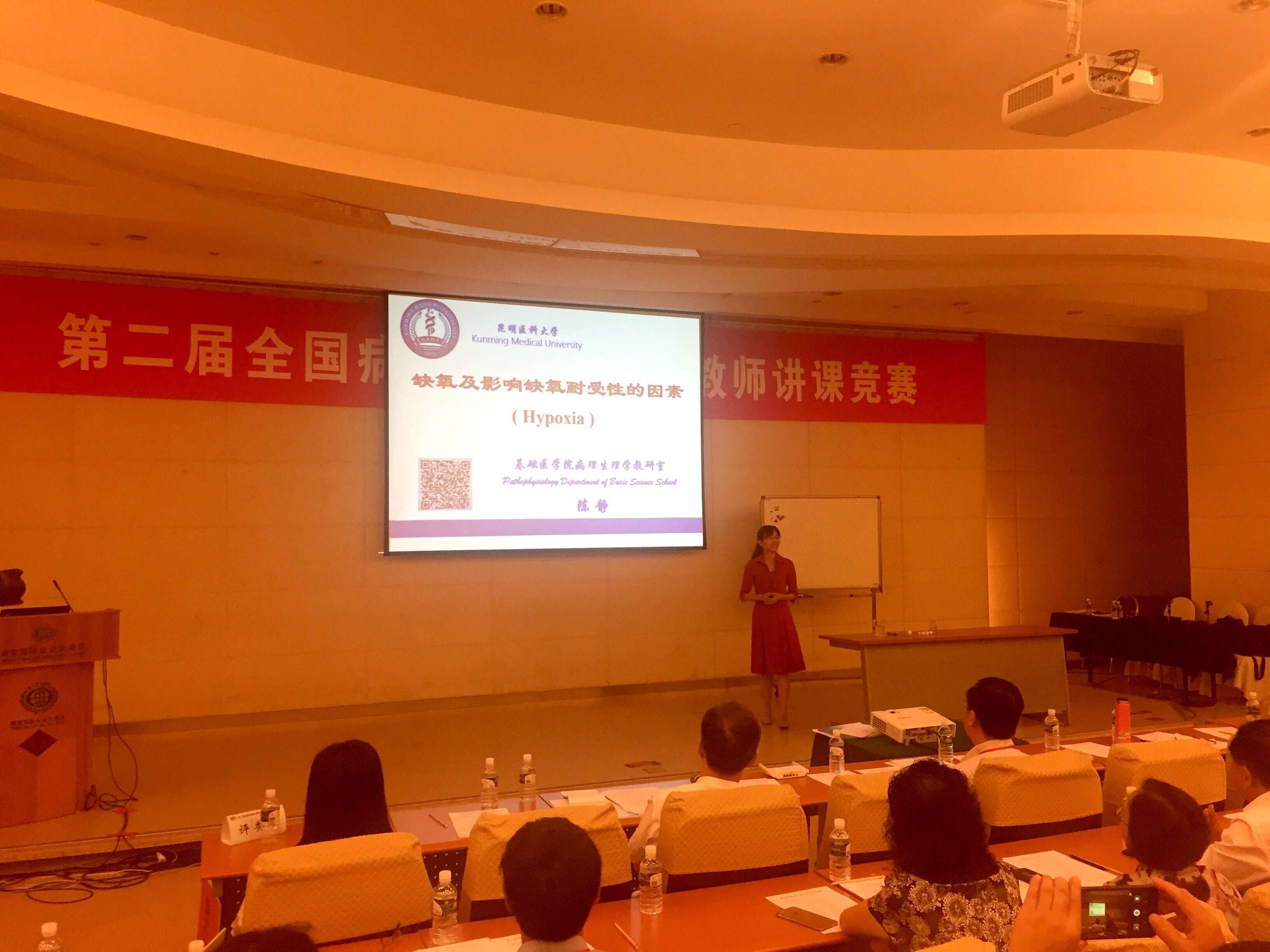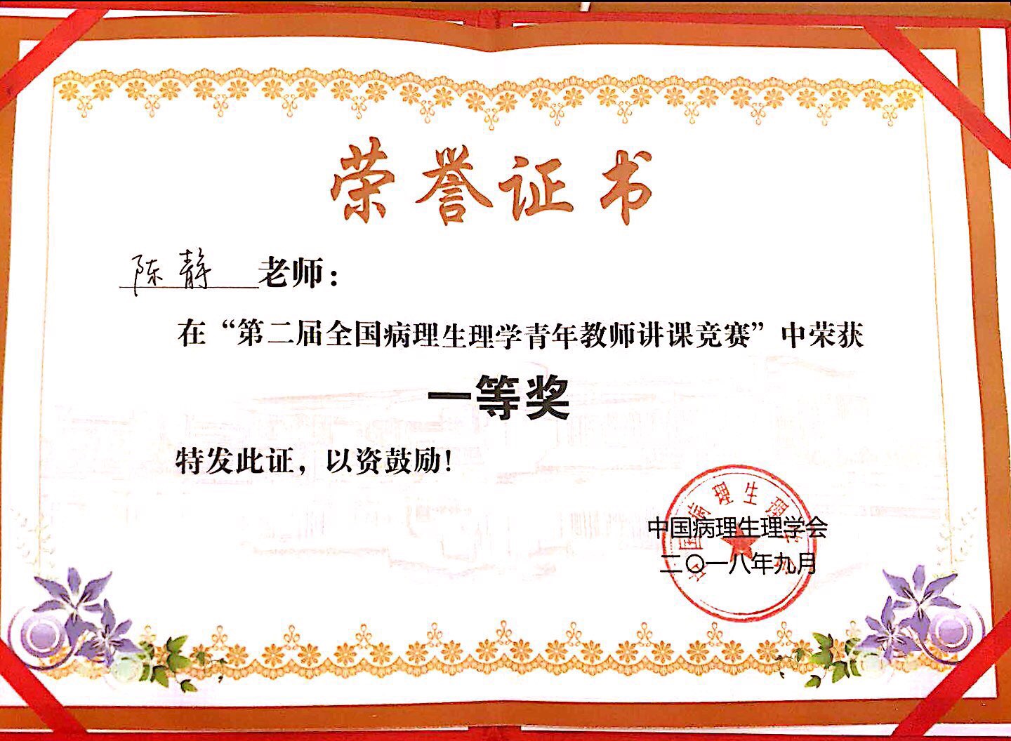 大赛分为预赛和决赛两个阶段,来自全国39所医学院校的39名参赛选手以提交15分钟教学视频的形式参加预赛,随后由评审专家组进行评审遴选出12名选手进入决赛。在决赛环节,陈静老师与来自北京大学医学部、上海交通大学医学院、浙江大学医学院、南京医科大学等知名院校的病理生理学同仁同台竞技,以精心巧妙的课堂设计、自然大方的教态、生动流利的表达、层层递进的启发式教学,为专家评委展示了一堂生动的病理生理学课程,最终脱颖而出,荣获一等奖,展示了我校青年教师良好的专业素质与教学风采。