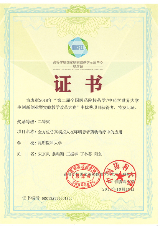 日前,由教育部高等学校国家级实验教学示范中心联席会和中国药科大学主办,天津大学药物科学与技术学院承办的第二届医药院校药学/中药学世界大学生创新创业暨实验教学改革大赛在天津大学津卫校区举行。我校药学院实验教学中心宋京风老师参赛的实验教学改革项目《全方位仿真模拟人在哮喘患者药物治疗中的应用》在比赛中获得二等奖。