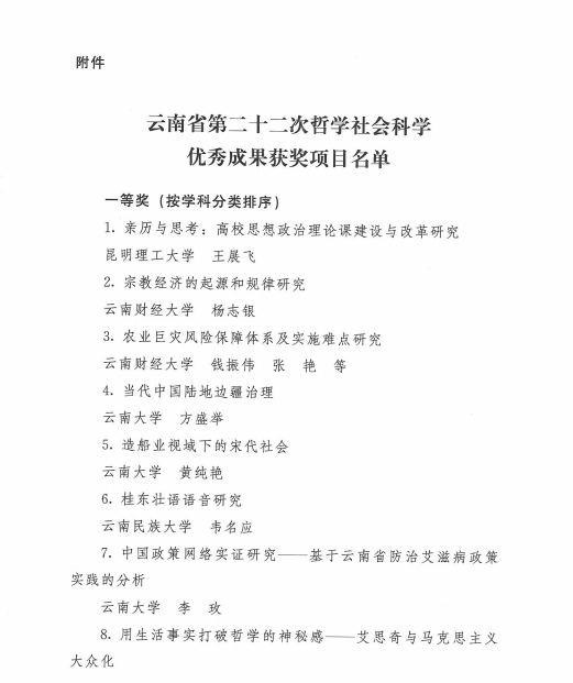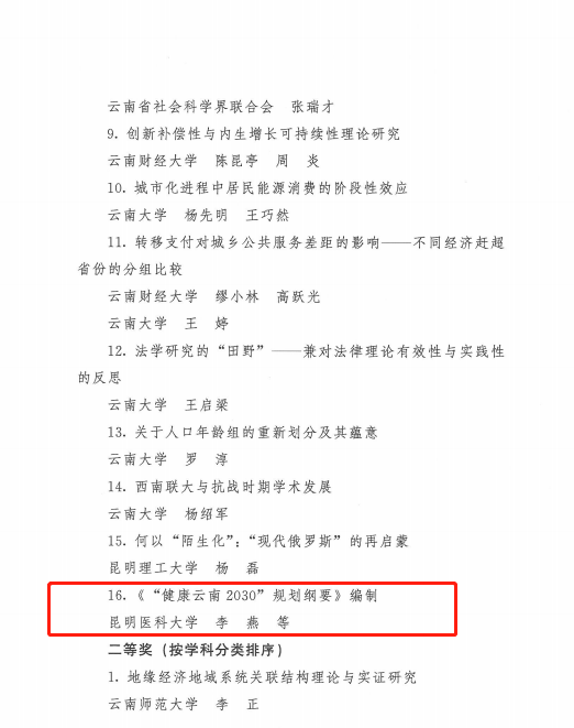 近日,云南省人民政府公布了云南省第二十二次哲学社会科学优秀成果奖励的决定,我校成果《“健康云南”2030规划纲要》编制获云南省哲学社会科学优秀成果一等奖。