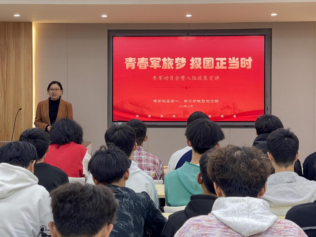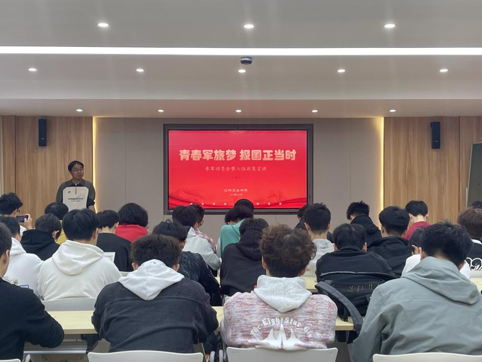 国防建设事关党和国家长治久安,事关国家主权安全,事关强国建设、民族复兴伟业。建设和发展一支“听党指挥、能打胜仗、作风优良”的人民军队是新形势下加强和巩固国防建设的必然要求,也是党和国家面对复杂多变国内国际发展大势的重要支撑。为进一步激励广大同学积极携笔从戎、报效国家,全方位增强同学们对于军旅生活的认识及对参军入伍政策的理解与把握。2024年10月23日18:00,公共卫生学院联合博学园“一站式”学生社区第一、第二功能型党支部在米兰milan官方网站“一站式”学生社区一二栋2楼多功能报告厅组织开展公共卫生学院2024年“青春军旅梦,报国正当时”征兵动员会暨参军入伍政策宣讲活动。