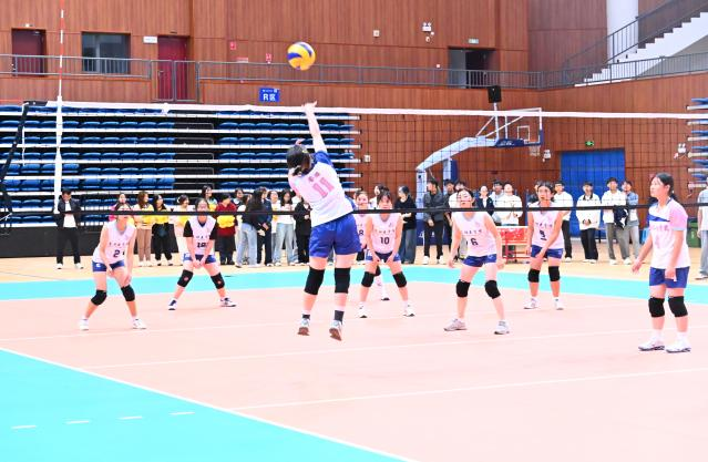 在球场上双方相互尊重,相互学习。随着裁判哨声响起,精彩的决赛开始了。公卫女排率先开球,直击对场,以迅雷不及掩耳之势夺下第一分。