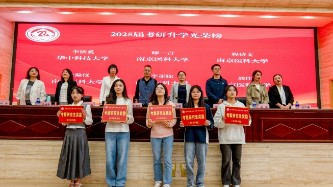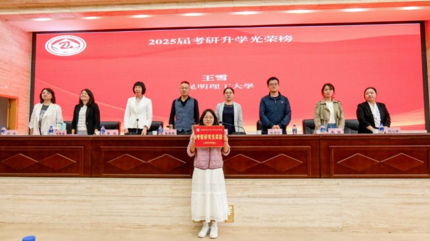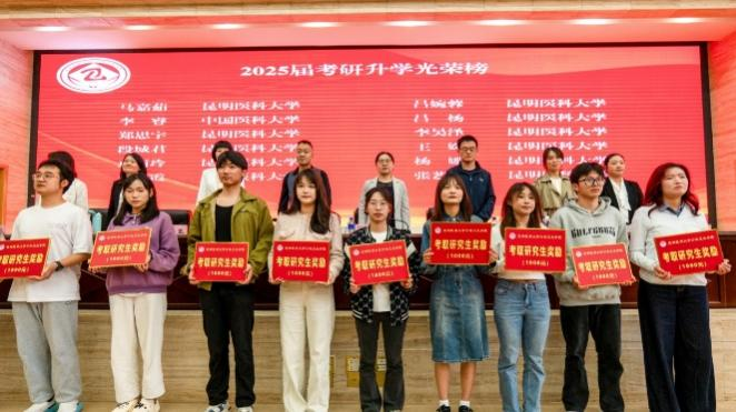 主席台就坐的党政领导为考取博士、硕士研究生的同学颁发了奖励。