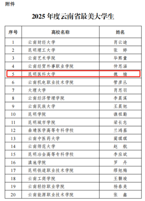 近日,云南省委教育工委、云南省委宣传部发布了《中共云南省委教育工委 中共云南省委宣传部关于公布2025年度云南省最美大学生推选结果的通知》。评选根据《云南省教育厅 中共云南省委宣传部关于开展2025年度云南省最美大学生推选展示活动的通知》精神,经学校推荐、材料评审、现场答辩、网站公示等环节,从全省推选出20名2025 年度云南省最美大学生。米兰milan官方网站公共卫生学院2023级公共卫生专业硕士研究生魏楠入选,荣膺“最美大学生”称号。