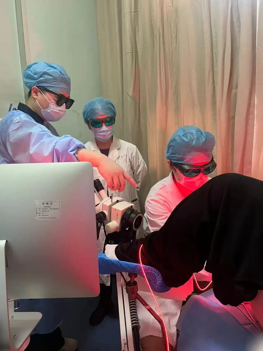 首例临床治疗患者为一名28岁女性,因高危HPV16型阳性于4月7日到医院妇科就诊,经详细检查后确诊为鳞状上皮高级别病变(CIN3)累及腺体。目前,针对CIN3的治疗方式主要为进行宫颈锥切手术。这种治疗方式能有效清除病变组织,但术后存在宫颈机能不全、宫颈管狭窄等问题,可能影响患者未来的妊娠功能。面对患者强烈的生育需求,妇科俞晶教授团队在认真分析患者病情后,决定采用系统性光动力技术(sPDT)进行治疗,并与患者进行了充分的术前沟通。5月18日,在妇科主任杨宏英、副主任张红平的指导及护士长李玉华护理团队等多方协作下,俞晶教授及魏洁主治医师为患者完成血卟啉衍生物(HpD)注射,经过48小时药物分布后,为患者进行宫颈局部激光照射治疗。