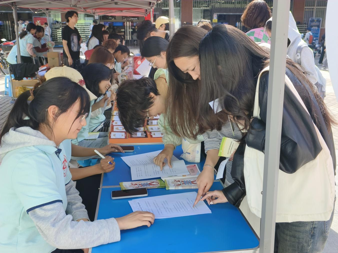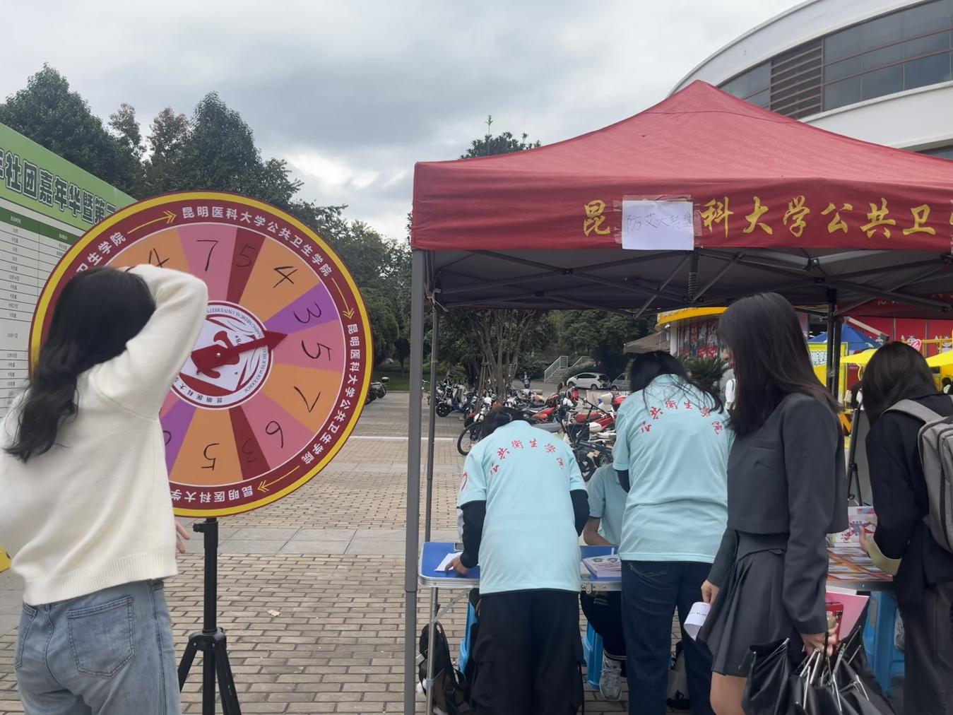 活动现场,围绕艾滋病防治与HPV疫苗接种等内容设置了多个展示区与活动参与区域,图文并茂的禁毒防艾知识海报、实物模型,吸引了大量师生驻足观看。“你好!要不要来参加我们的趣味游戏?答对有奖哦!”志愿者不断发出邀请,师生们纷纷参与到“防艾大转盘”“禁毒知识连连看”“健康谣言粉碎机”等趣味游戏中,参与者在答题中强化对传染性疾病的风险认知与验证理解。同时,昆明市呈贡区疾病预防控制中心在HPV疫苗预约咨询区域,为在校师生送“苗”上门、现场解答接种疑惑。