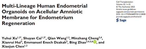 2023年12月14日,米兰milan官方网站类器官研究院院长赵冰教授团队在Cell Transplantation杂志在线发表了题为“Multi-Lineage Human Endometrial Organoids on Acellular Amniotic Membrane for Endometrium Regeneration”的研究论文,他们开发了一种包含EEOs和eMSCs的多谱系子宫内膜类器官(multi-lineage endometrial organoids,MLEOs),探究了该类器官在修复受损子宫内膜和减缓细胞凋亡中的效率。随后,研究团队将MLEOs植入HAAM中形成MLEO-HAAM的复合结构,进一步研究表明MLEO-HAAM贴片能够有效修复机械磨损至基底层的损伤子宫内膜,并能改善妊娠结局,提出MLEO-HAAM贴片有望成为一种修复受损子宫内膜的有效方法。