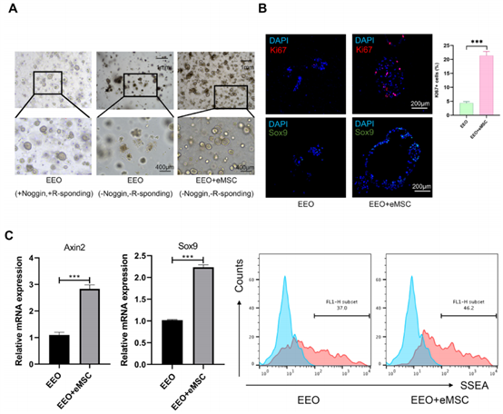 为了进一步确定间充质细胞是否能作为干细胞微环境支持上皮干细胞的正常功能和自我更新。研究人员首先在能维持EEOs自我更新的体外扩增的3D基质胶培养体系中撤去了Rspo1和Noggin,发现该体系中EEOs无法增殖和自我更新。然而,当EEOs与eMSCs共培养时,Rspo1和Noggin的缺失并不影响类器官的自组装(图2-A)。免疫荧光检测显示,共培养组的类器官中表达增值标志物Ki67和干性标志物Sox9的细胞数量显著增多(图2-B)。RT-qPCR分析显示,共培养组的类器官中干性相关基因(Axin2和Sox9)表达水平明显上调(图2-C)。流式细胞术显示,共培养组中干性标志物SSEA-1阳性表达的细胞(图2-C)的比例明显增加。以上结果表明eMSCs提供了支持EEOs生长和自我更新的微环境。