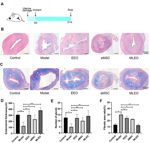 为了进一步明确MLEOs是否具有修饰受损子宫内膜的能力。研究人员首先通过刮宫手术建立了子宫内膜损伤的大鼠模型,随后将MLEOs 移植到受损子宫内,术后两周收集组织进行评估(图3-A)。H&E染色显示,相较于对照组,所有细胞治疗组(包含了单移植EEO组、单移植eMSC组以及单移植MLEO组)的子宫内膜厚度和腺体数量均显著改善,其中 MLEO组改善最明显(图3-B-D-E)。Masson三色染色显示,MLEO 组的纤维化面积显著低于其他组(图3-C-F)。这些结果表明,MLEOs 在修复受损子宫内膜方面具有显著效果。