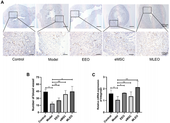 为了评估不同治疗方法的血管生成能力,研究人员收集的大鼠子宫组织中进行了内皮细胞标志物CD31的免疫组织化学染色。结果显示,MLEO 组的 CD31 表达显著高于其他组(图4-A-B)。RT-qPCR 分析显示MLEO 组的子宫内膜受容性标记基因 integrinβ3 表达最高(图4-C),该结果提示MLEOs 可能改善受损子宫的妊娠结局。