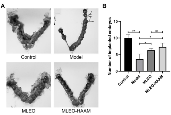 为了进一步提高MELOs的修复效率,研究人员将MLEOs种植在HAAM上后形成MLEOs-HAAM贴片(图5)。为了进一步评估MLEO-HAAM贴片对子宫内膜修复的有效性,研究人员将子宫内膜损伤的大鼠模型分为三组:模型组(Model)、MLEO修复组和MLEO-HAAM修复组,随后进行了胚胎移植实验。结果显示,MLEO-HAAM组的着床胚胎数量最多(图6),表明MLEO-HAAM贴片能够有效修复新损伤的组织,改善妊娠结局。