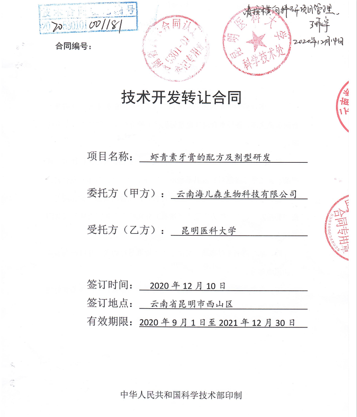 三七多糖具有抗氧化能力,并具有吸湿和保湿性能,是极佳的牙膏添加成分,以球形二氧化硅为摩擦剂,将PNPS、单氟磷酸钠、虾青素微囊粉作为功效成分,中心现已完成开发具有双重抗氧化效果,膏体橙色透明、护龈洁齿的牙膏产品,此款产品已实现技术转让。