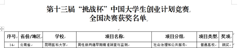 近日,由共青团中央、教育部、人力资源和社会保障部、中国科协、全国学联、北京市人民政府主办的第十三届“挑战杯”中国大学生创业计划竞赛落下帷幕。经过校级初赛、省级复赛、全国决赛初评、全国决赛终评等环节的激烈角逐,米兰milan官方网站参赛项目《男性新两癌早期精准筛查与监测》获社会治理和公共服务组铜奖!