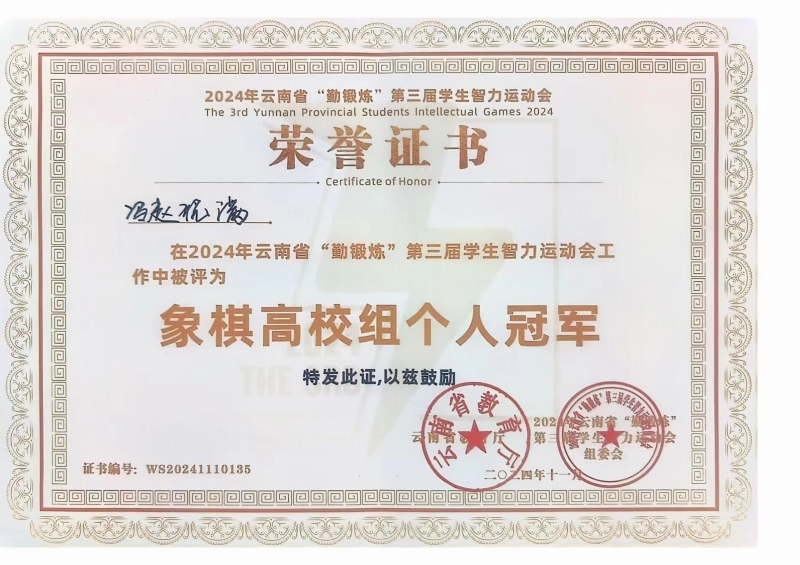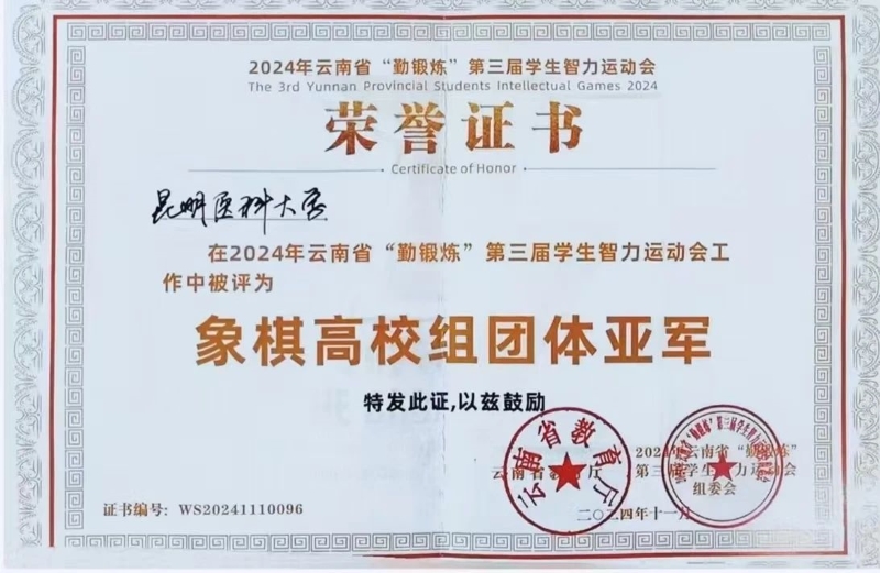 近日,云南省第三届“勤锻炼”智力运动会圆满落幕,米兰milan官方网站代表队凭借出色的表现在象棋项目中获高校组个人赛冠军1项、季军1项以及高校组团体亚军的好成绩。