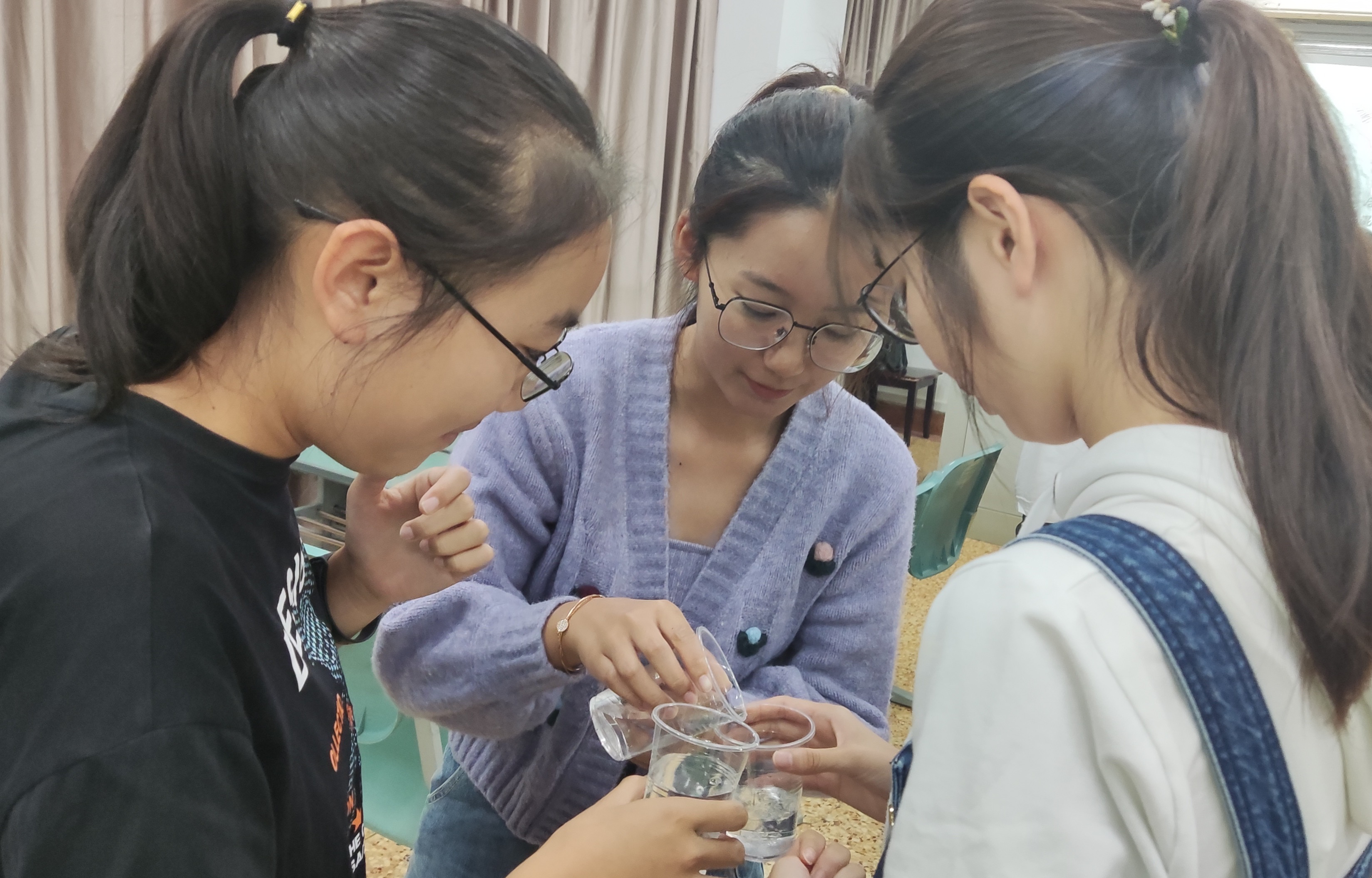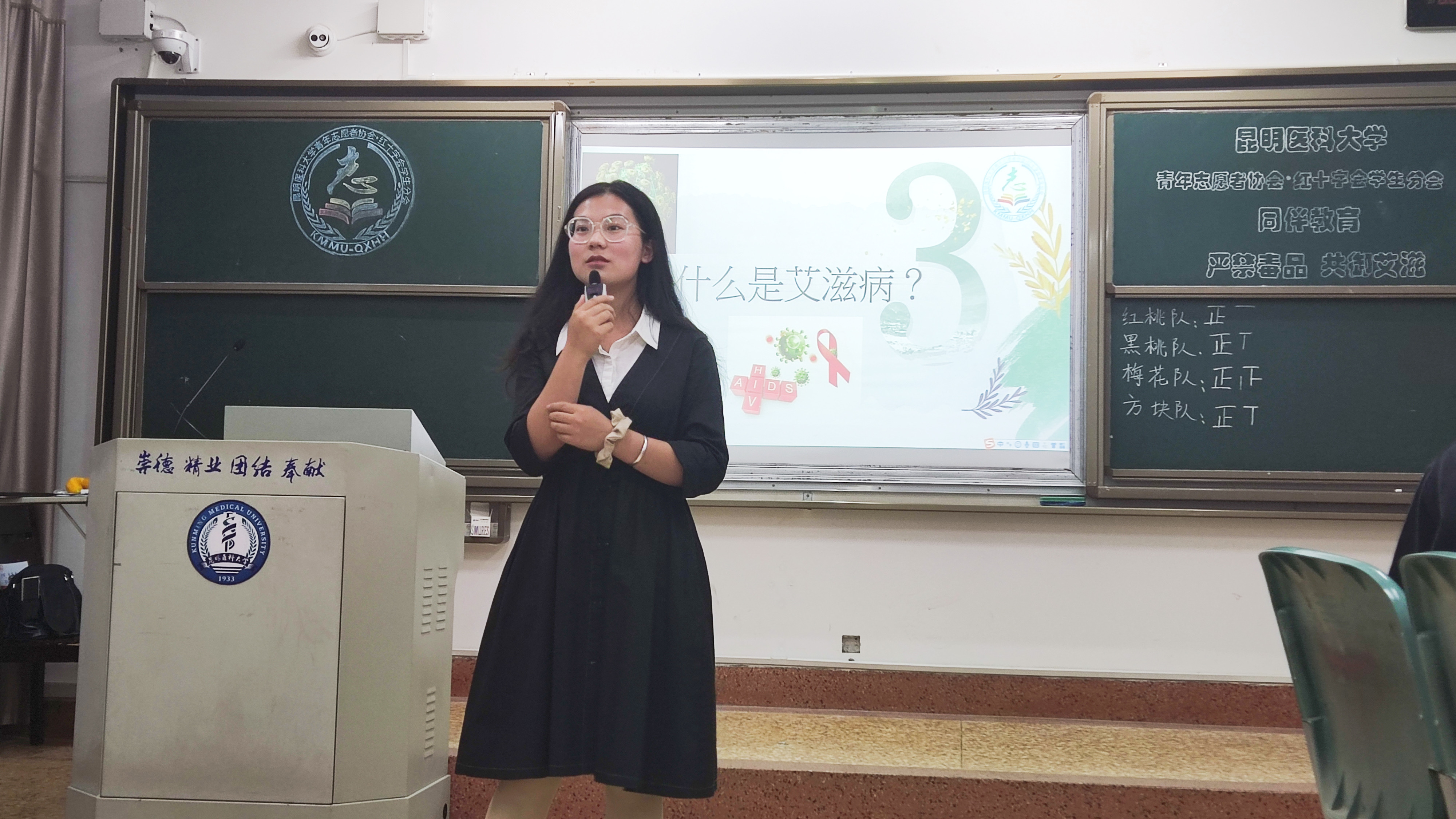 同学们根据进门时随机抽取的小卡片被分成了红桃、黑桃、梅花、方块四个小组,以小组为单位来“比赛”。对于禁毒,讲解员利用真实数据和真实案例,让同学们感受到毒品带来的危害,从而呼吁更多的人抵制毒品。在讲解有关艾滋病知识时,志愿者们用有关知识抢答的小游戏来活跃气氛,让同学们深入了解艾滋病,从而更好地防御艾滋。在志愿者们展示安全套的正确使用方法后,同学们自告奋勇地上台展示自己的学习成果。活动过程中的小实验也很有意义,志愿者们分发给每个同学一杯看似普通透明的“水”,引导大家将其相互混合来模拟HIV传播,巧妙地让同学们体会到艾滋病的传播之快、传播之广。