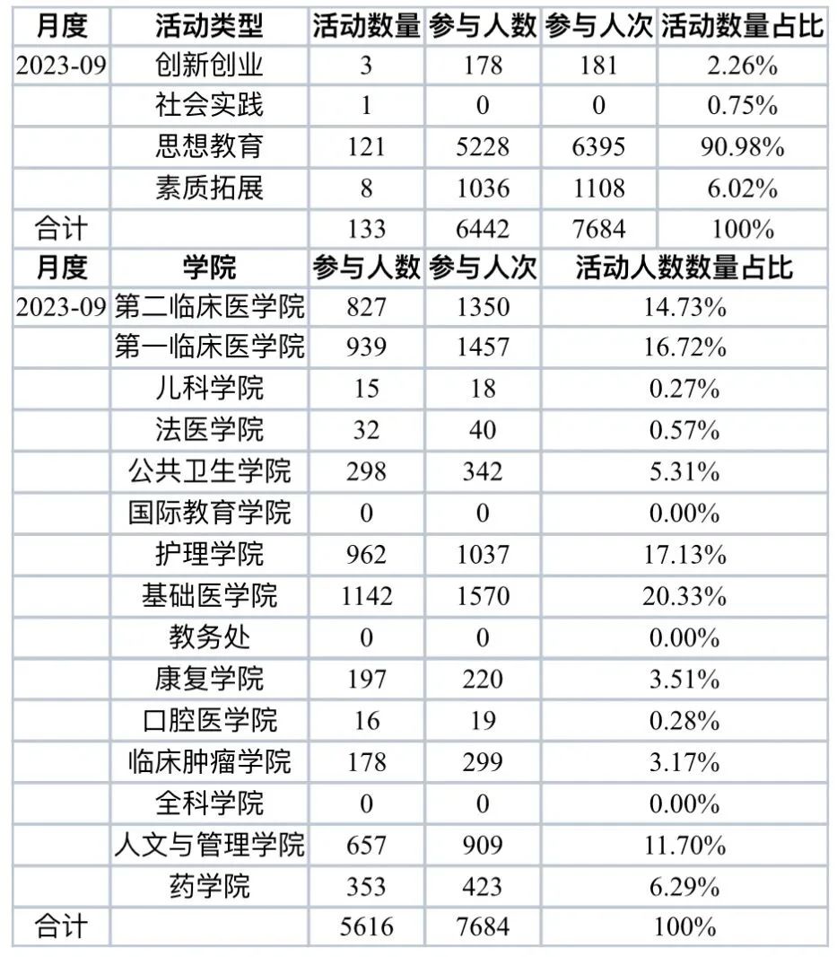 截止2023年9月30日,“第二课堂”平台共开展活动133项,参与人数6442人,参与人次7684次。