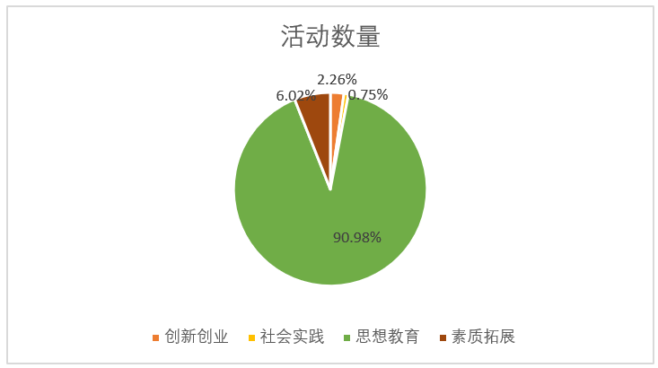 活动类型包括创新创业、社会实践、思想教育、素质拓展。创新创业类活动开展3项,社会实践类活动开展1项,思想教育类活动开展121项,素质拓展类活动开展8项。