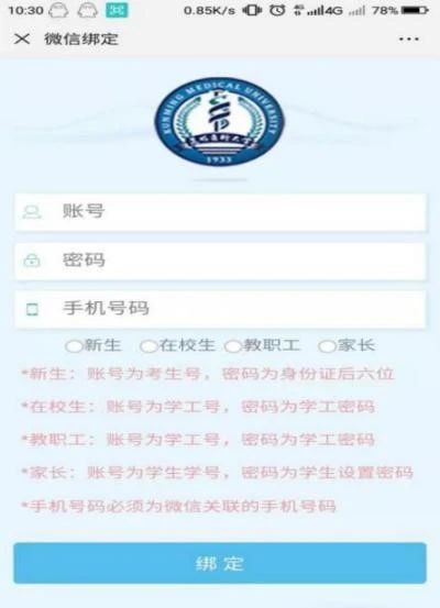 ②绑定账户,学生账号为学号,2023级初始密码为身份证号,选择“在校生“,点击绑定;