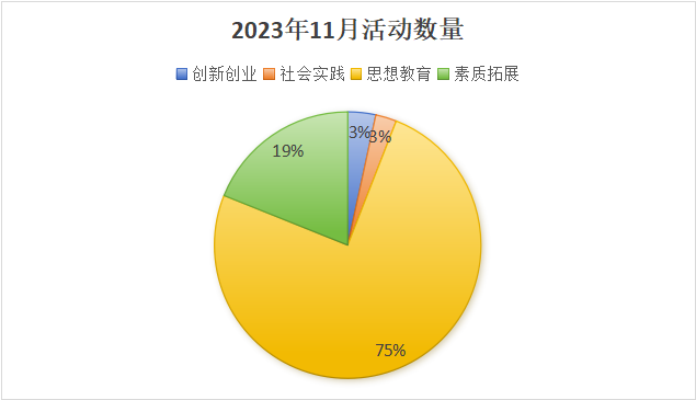 活动类型包括创新创业、社会实践、思想教育、素质拓展。创新创业类活动开展12项,社会实践类活动开展9项,思想教育类活动开展266项,素质拓展类活动开展67项。