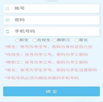 ②绑定账户,学生账号为学号,2023级初始密码为身份证号,选择“在校生”,点击绑定;