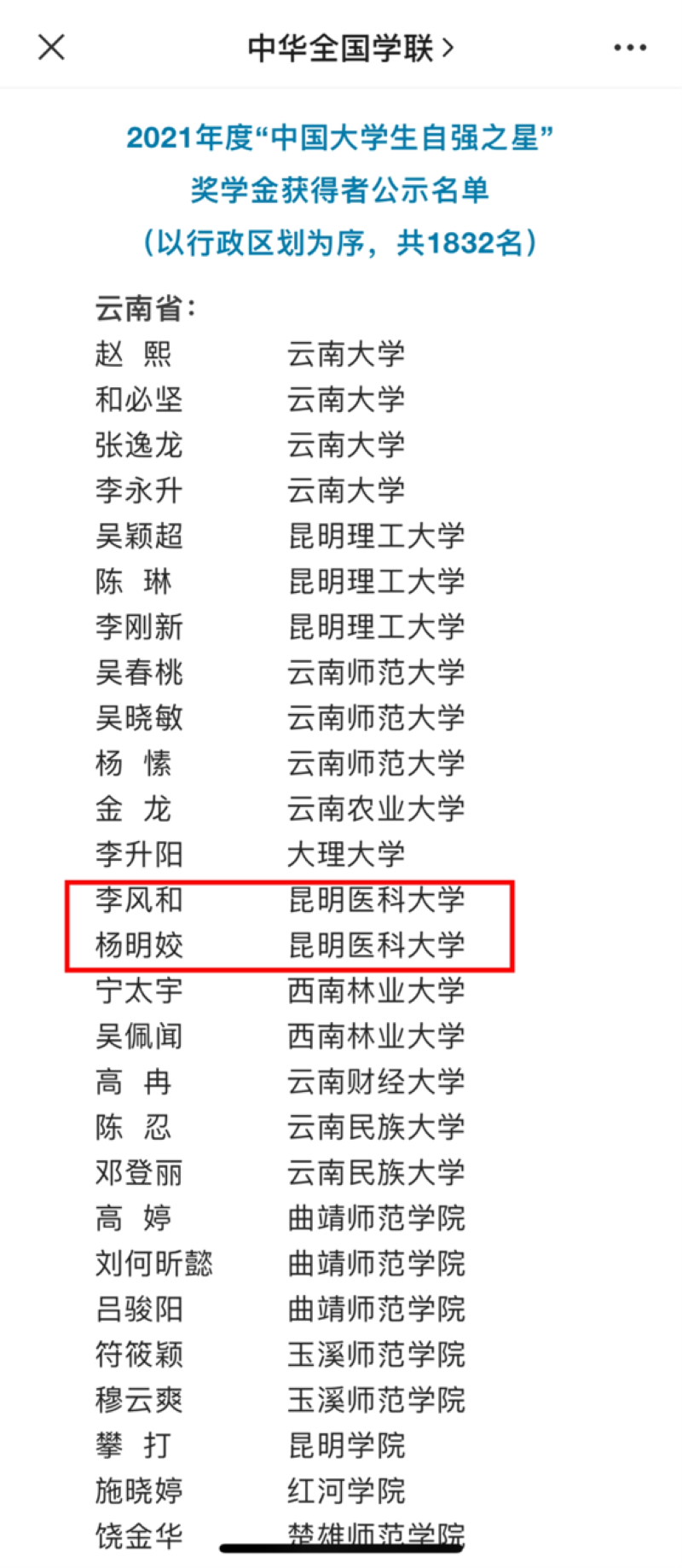 2021年度“中国大学生自强之星”活动以“请党放心,强国有我”为主题,最终经各高校推荐、省级初评、全国评审等环节,我校第二临床医学院2018级临床医学十二大班李风和、口腔医学院2020级口腔一大班杨明姣两名同学荣获2021年度“中国大学生自强之星”奖学金,为昆医学子树立了热爱祖国、品行优良、不畏艰难、自强不息的榜样。