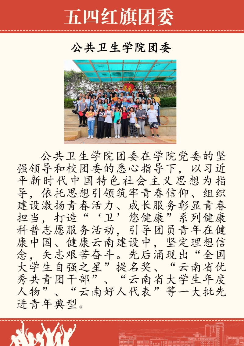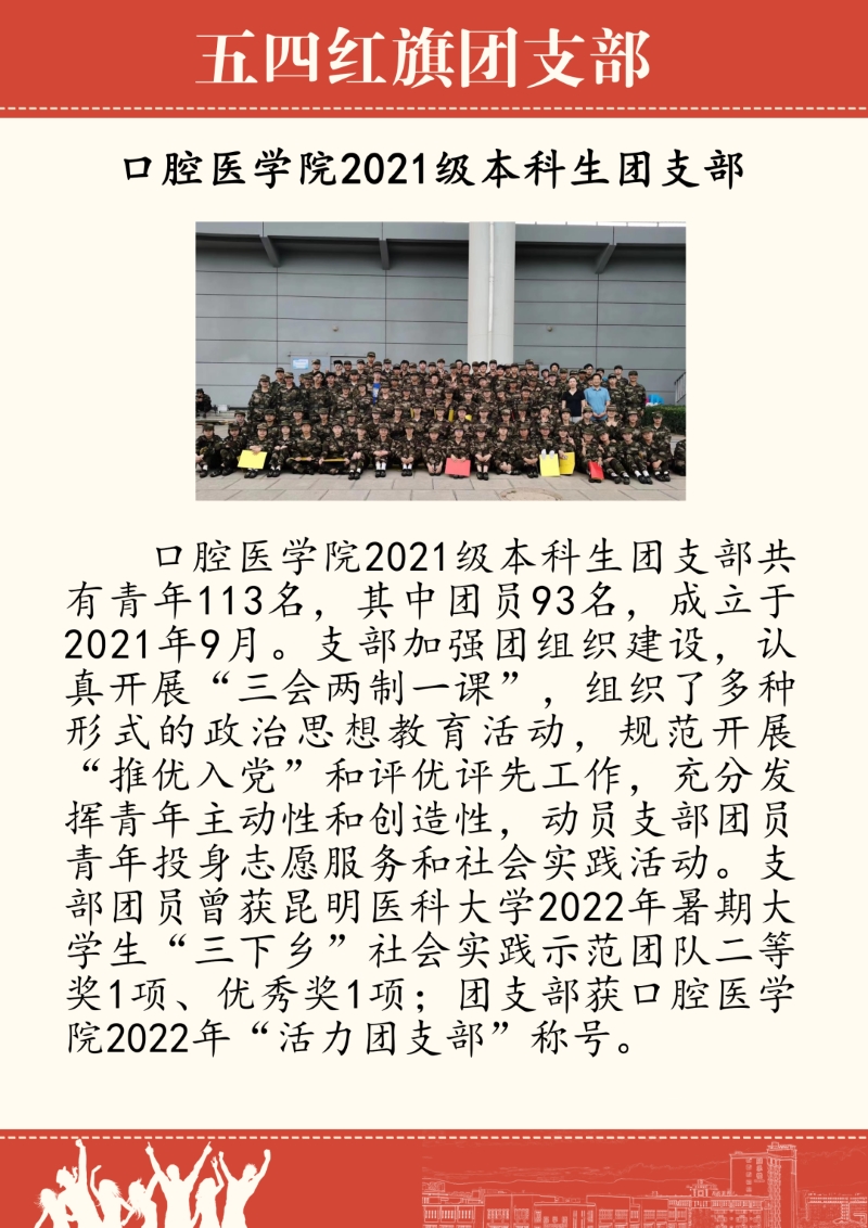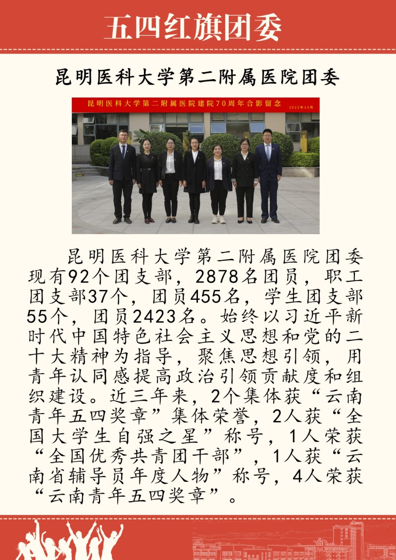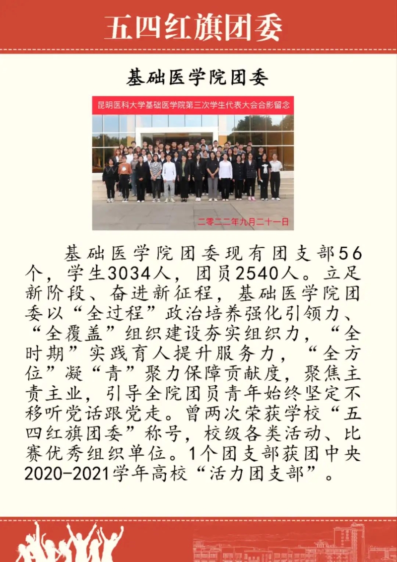 2022年度,我校各级团组织和广大团员、团干部牢记初心使命,在推进医疗卫生事业、学校改革建设发展、共青团工作中发挥了生力军和突击队作用,涌现出了一大批先进典型,用实际行动践行了“请党放心、强国有我”的青春誓言。我校1个团委获“全国五四红旗团委”,1个团支部入围“全国高校活力团支部最具组织力TOP100”,2名青年获“中国大学生自强之星”,2个青年集体获“云南省青年文明号”。学校对4家“五四红旗团委”、56个“五四红旗团支部”、21个“青年文明号”、616名“优秀共青团员”、187名“优秀共青团干部”、110名“青年岗位能手”、256名团学工作和活动“先进个人”及10名“标兵”予以表彰。