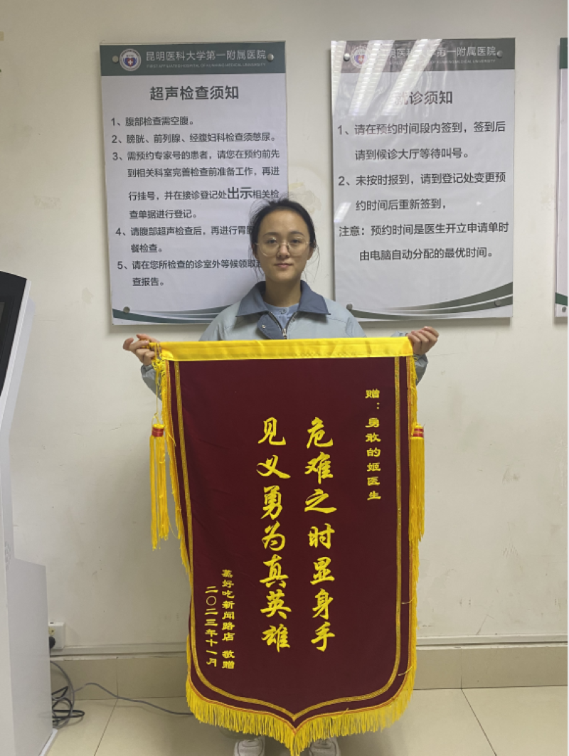 生活开始按着平常的路线行进着,直到半个月后的一个中午,姬向瑜同学再次到店内用餐,店员立刻就认出了她,说他们店长一直在寻找她,想能当面感谢她一下,得知她是昆医大附一院的研究生后,店家于12月8日中午来到医院里找到了她,并赠予其一面锦旗,感谢其见义勇为、出手相助、专业施治的感人行为。