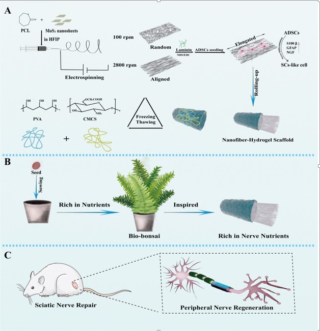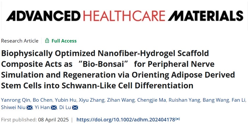 Qin Y, Chen B, Hu Y, Zhang X, Wang Z, Ma C, Yang R, Wang B, Li F, Niu S, Han Y, Lu D. Biophysically Optimized Nanofiber-Hydrogel Scaffold Composite Acts as "Bio-Bonsai" for Peripheral Nerve Simulation and Regeneration via Orienting Adipose Derived Stem Cells into Schwann-Like Cell Differentiation. Adv. Healthc. Mater. 2025 Apr 8: e2404178.