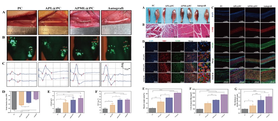 经体内外实验证实APML@PC具有良好的生物相容性和合理的生物降解行为,并具有促进轴突生长、髓鞘再生和神经功能恢复的能力。该研究为干细胞治疗周围神经再生提供了一个新的视角,从而为临床有效治疗PNI开辟了新的途径。