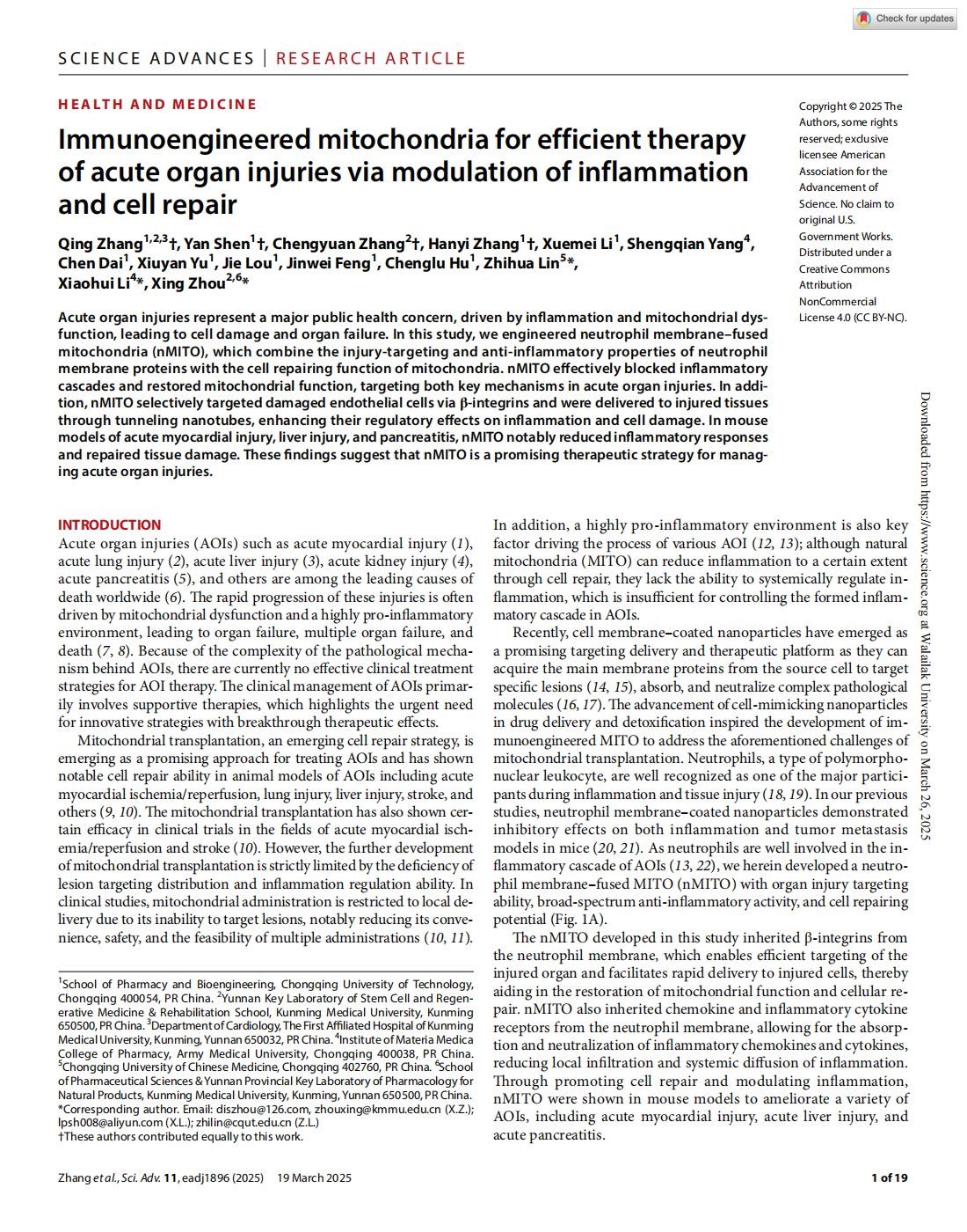 Qing Zhang et al., Immunoengineered mitochondria for efficient therapy of acute organ injuries via modulation of inflammation and cell repair. Sci. Adv. 11, eadj1896(2025). DOI:10.1126/sciadv.adj1896
