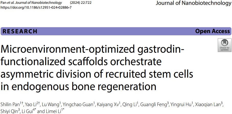 Pan S, Li Y, Wang L, Guan Y, Xv K, Li Q, Feng G, Hu Y, Lan X, Qin S, Gui L, Li L. Microenvironment-optimized gastrodin-functionalized scaffolds orchestrate asymmetric division of recruited stem cells in endogenous bone regeneration. J Nanobiotechnology. 2024 Nov 20; 22(1):722. doi: 10.1186/s12951-024-02886-7.