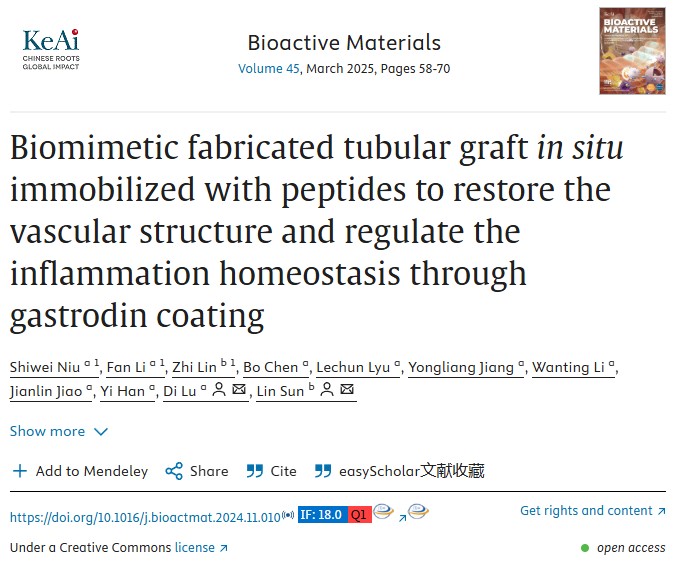 Niu S, Li F, Lin Z, Chen B, Lyu L, Jiang Y, Li W, Jiao J, Han Y, Lu D, Sun L. Biomimetic fabricated tubular graft in situ immobilized with peptides to restore the vascular structure and regulate the inflammation homeostasis through gastrodin coating. Bioact Mater. 2024 Nov 15; 45: 58-70. doi: 10.1016/j.bioactmat.2024.11.010.