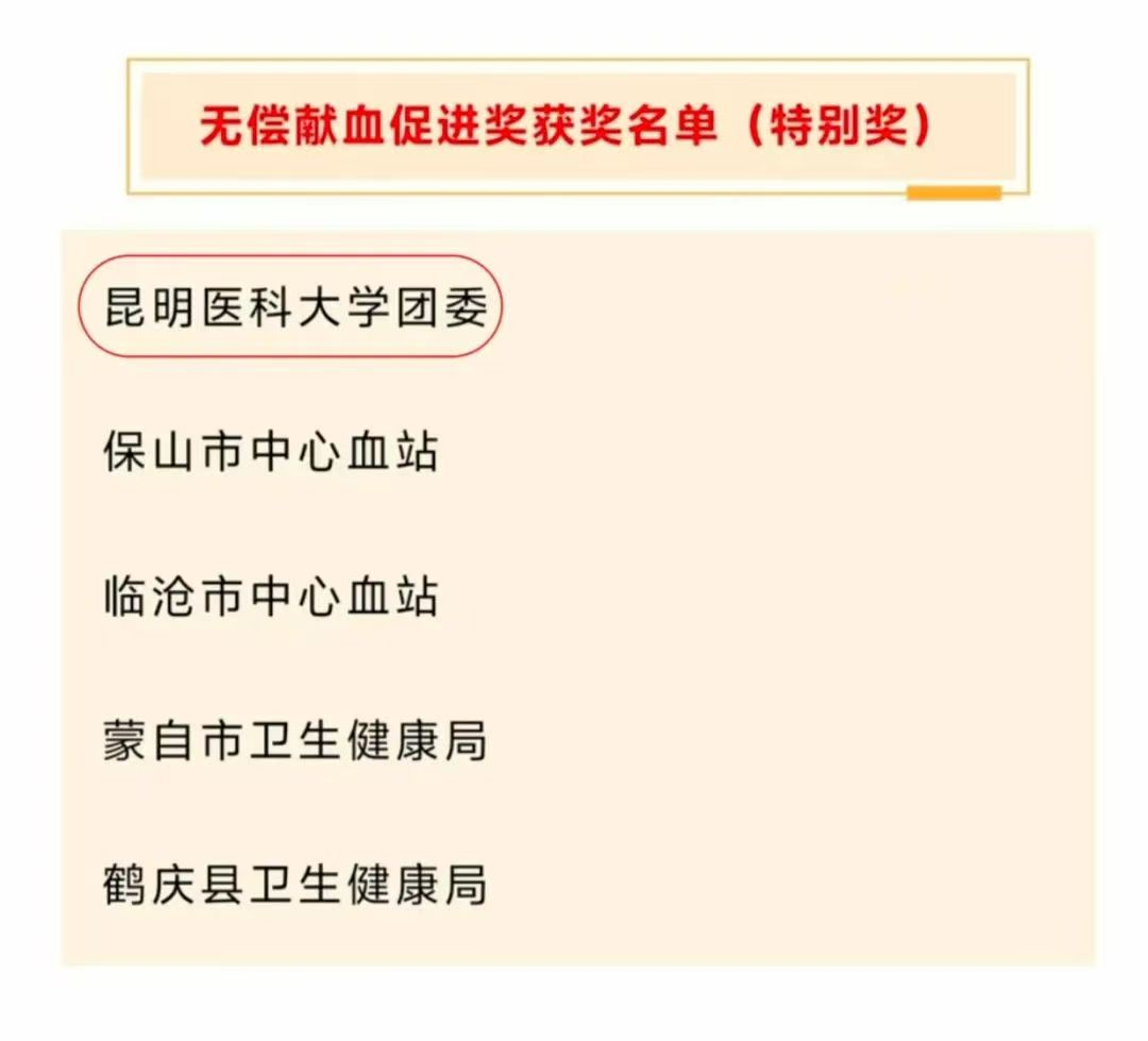 近日,国家卫生健康委员会、中国红十字会总会、中央军委后勤保障部卫生局联合印发《关于表彰2022—2023年度全国无偿献血表彰奖励获奖者的决定》,对2022—2023年度在无偿献血工作中作出突出成绩的单位和个人予以表彰。米兰milan官方网站团委获全国无偿献血促进奖(特别奖),云南省共5家单位获此表彰。