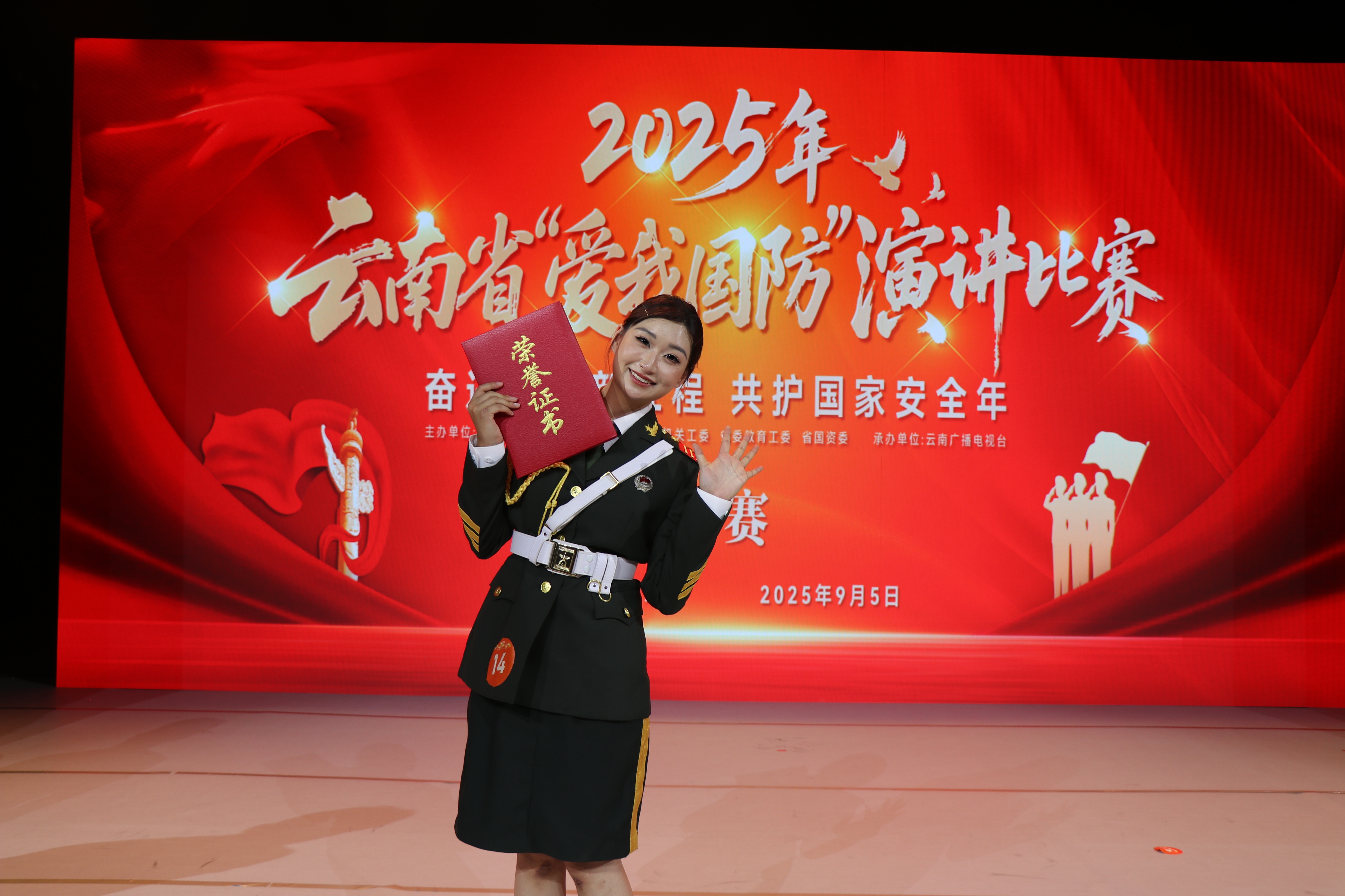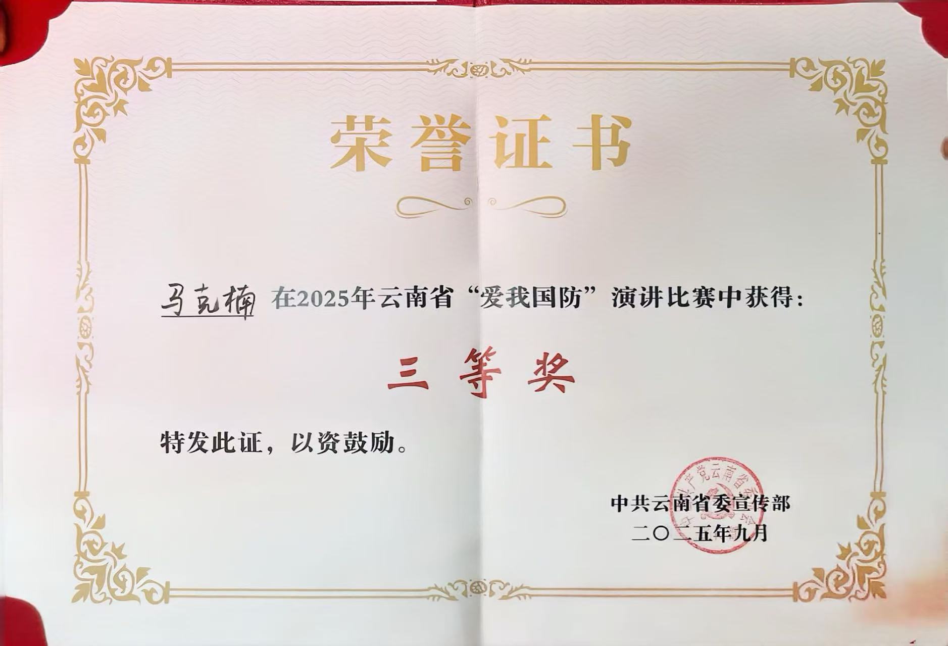 9月5日,由中共云南省委宣传部主办,中共云南省委省直机关工委、中共云南省委教育工委、云南省国资委协办的2025年云南省“爱我国防”演讲比赛决赛在昆明举办。米兰milan官方网站人文与管理学院马克楠同学获三等奖,学校获优秀组织奖。