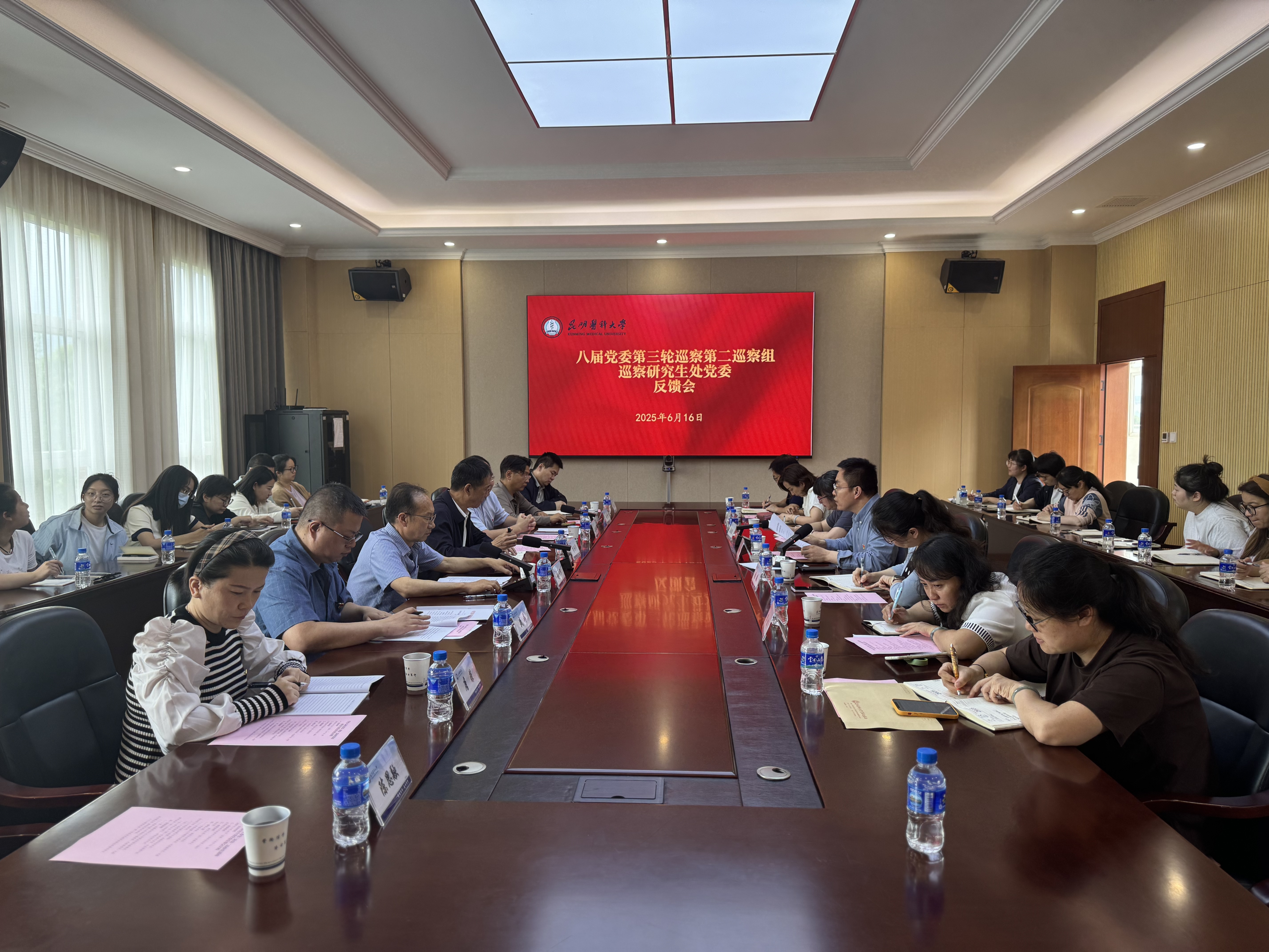 6月16日,学校八届党委第三轮第二巡察组向研究生处(院)党委反馈巡察情况。学校党委常委、副校长李利华出席会议。党委巡察工作领导小组成员、纪委副书记、纪委办公室(监察办公室)主任高伟民,第二巡察组全体成员,研究生处(院)班子成员、全体职工、研究生代表参加会议。党委巡察办副主任盛海列席会议。会前,巡察组向研究生处(院)党委书记杨兵兵反馈了巡察意见。