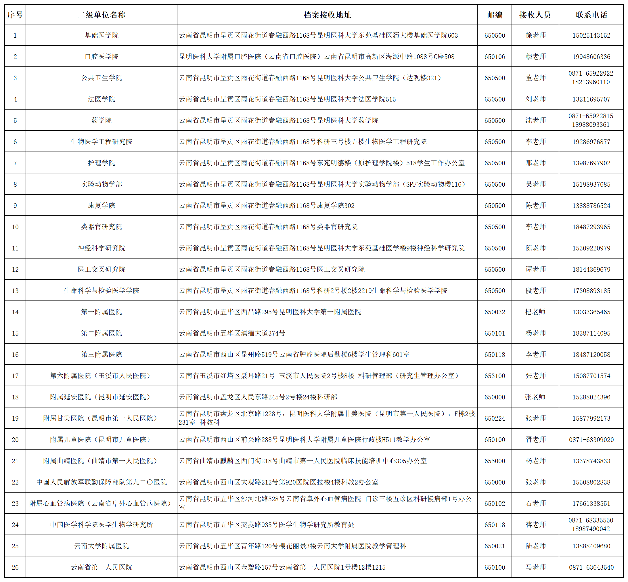 (一)录取类别为“全日制非定向”考生可于2025年6月30日(星期一)11:00后登录“米兰milan官方网站博士研究生招生管理系统”(https://kybs.kmmu.edu.cn),通过“调档函打印”模块下载打印本人《调档函》,按照本人人事档案所在单位全称填写调档函抬头,按照调档函上的档案寄送地址自行将档案寄送至拟录取的二级研究生培养单位(具体详见下表)。不需填写《米兰milan官方网站研究生考生思想政治及工作表现情况调查表》。如需盖红章的调档函原件,请考生与研究生招生办公室联系。“硕博连读”拟录取考生不需调取档案。