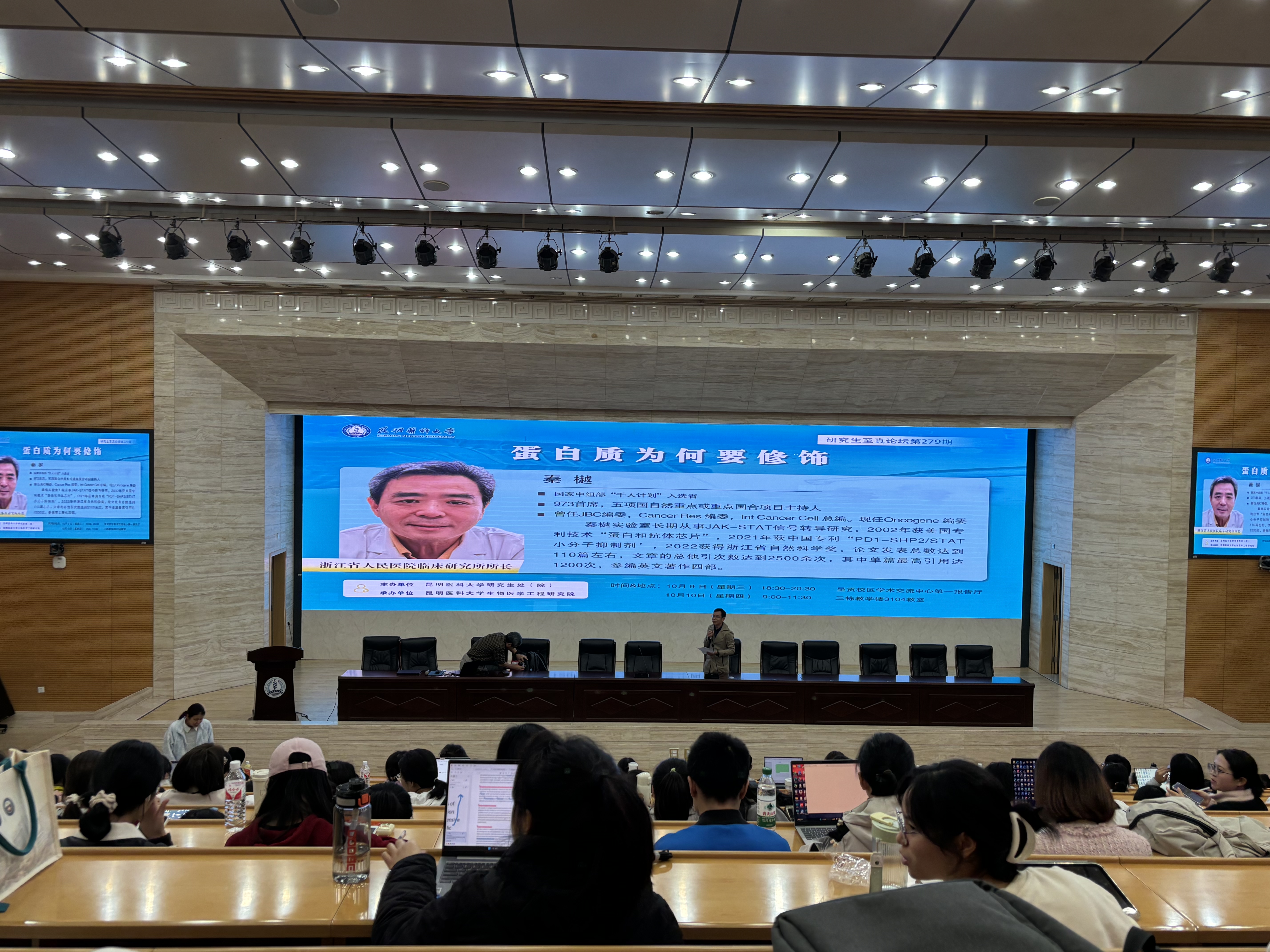 10月9日-10日,由米兰milan官方网站研究生院主办、生物医学工程研究院承办的第279期研究生至真论坛《蛋白质为何要修饰》在呈贡校区学术交流中心第一报告厅成功举办。全校博士、硕士研究生200余人聆听讲座。