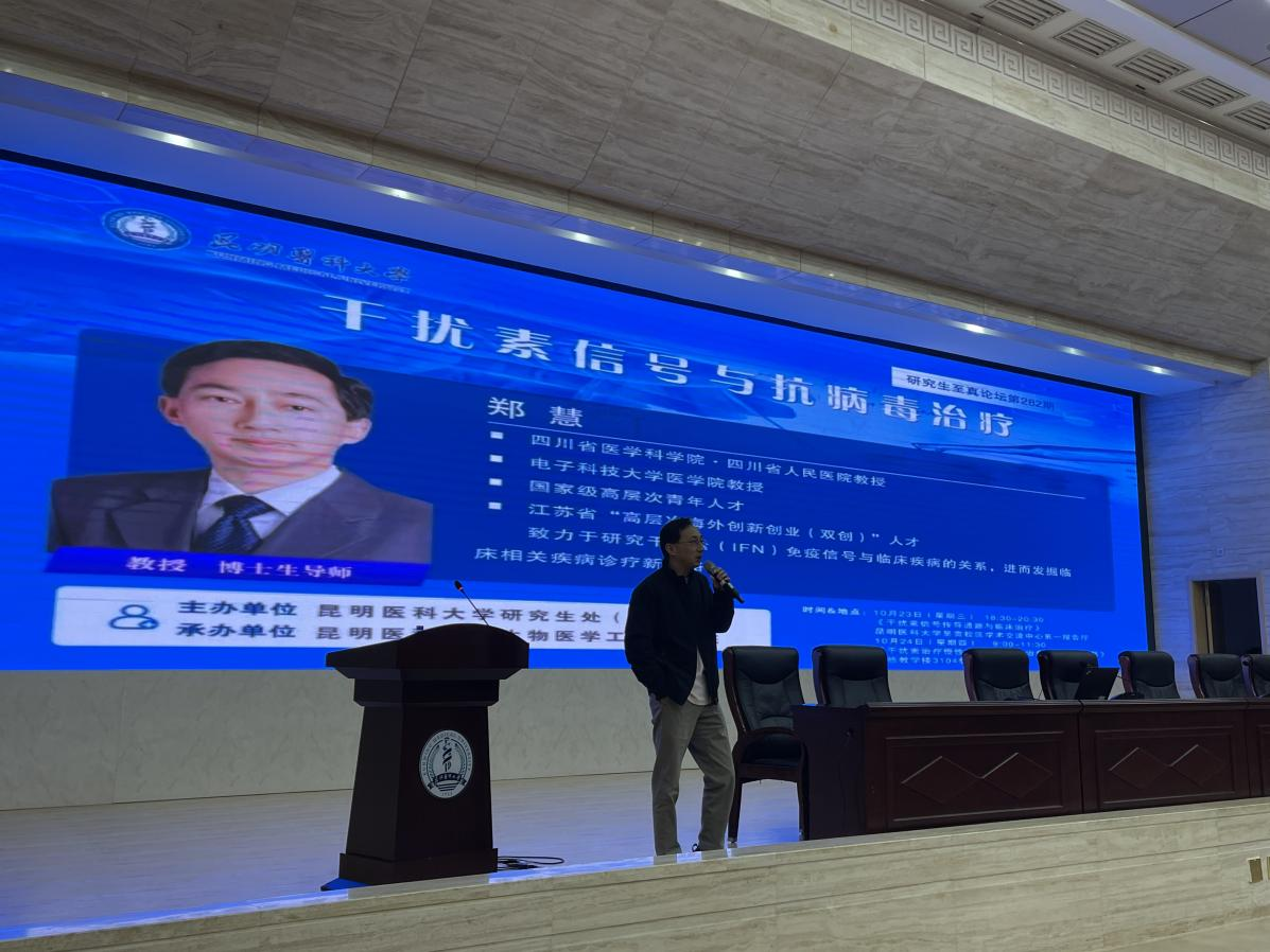 本期论坛的主讲人是四川省医学科学院、四川省人民医院郑慧教授。他从干扰素的研发历史引入,阐述了干扰素信号传导在临床疾病中的调控机制,并以慢性乙肝治疗为例,讲解了干扰素的临床疾病治疗应用。同时,郑慧还分析了干扰素的研究进展和应用前景,与同学们进行了积极互动。