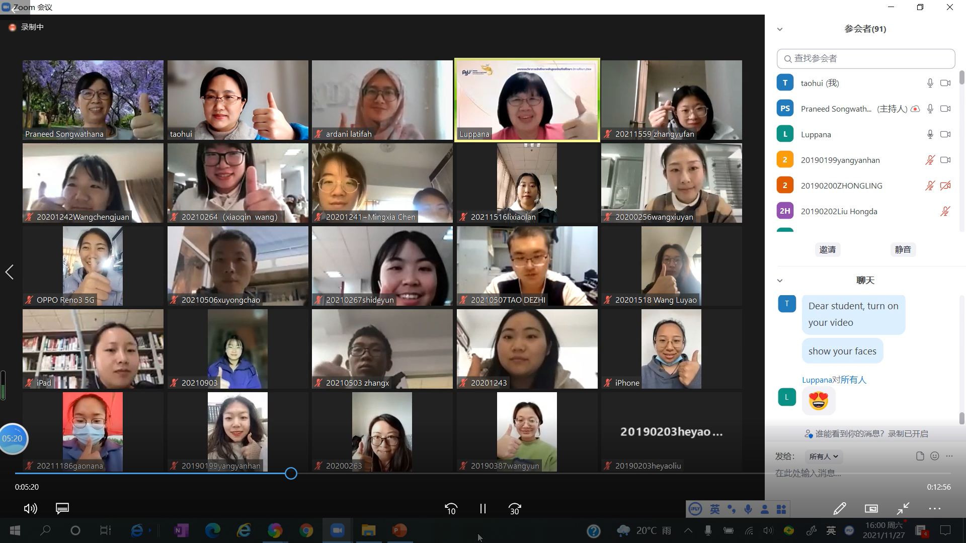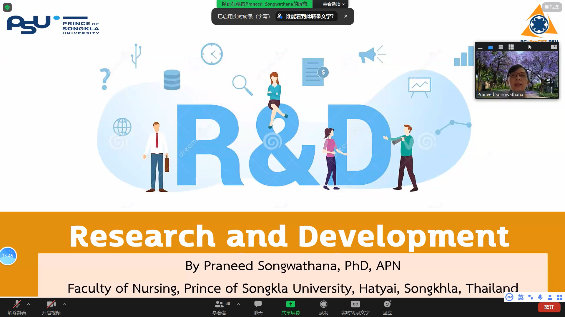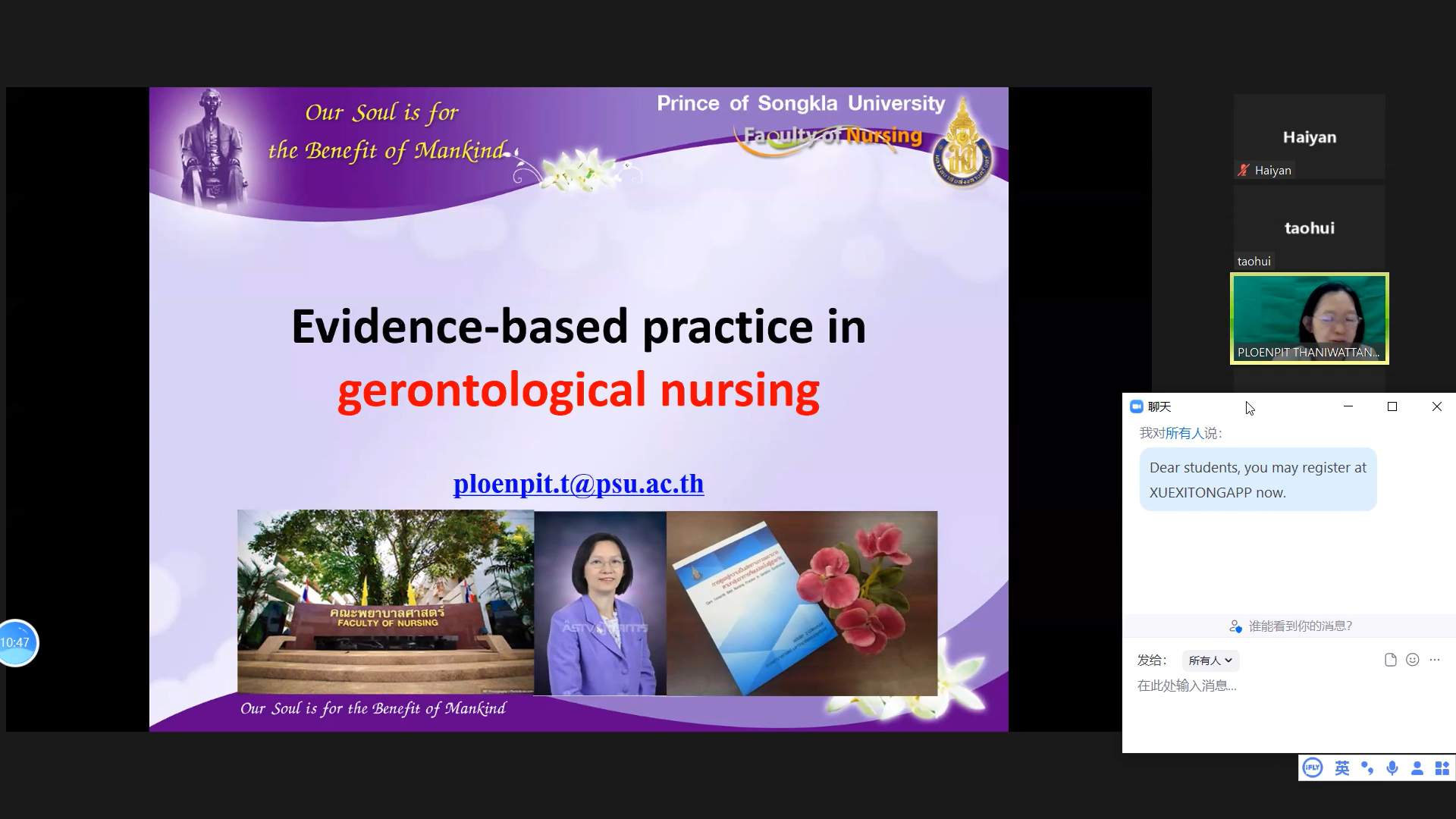 基于该项目经费支持,护理学院特邀泰国宋卡王子大学老年护理、循证护理领域颇有建树的七位专家学者作为主讲嘉宾,面向我院三个年级的全日制护理研究生123人,利用10-11月间的周末时间,以在线直播的方式举办了为期六天的学习班。
