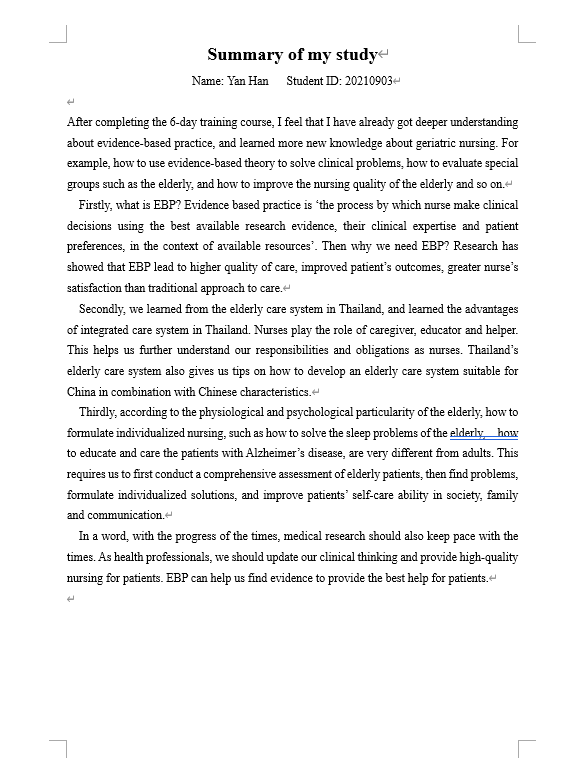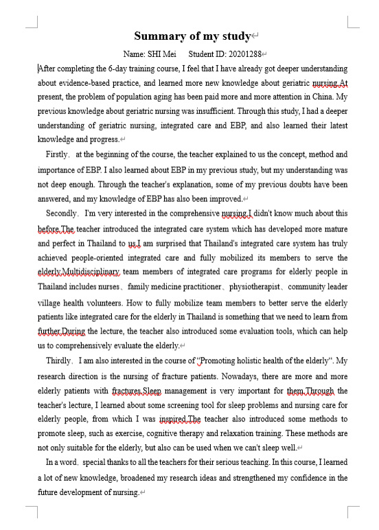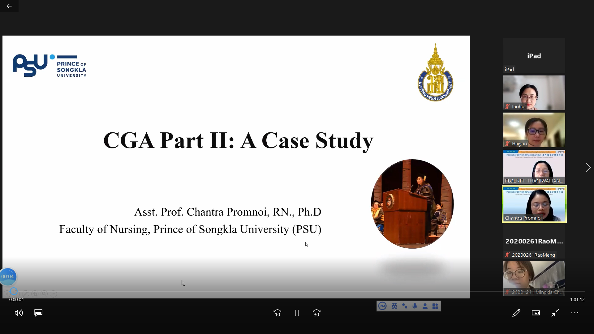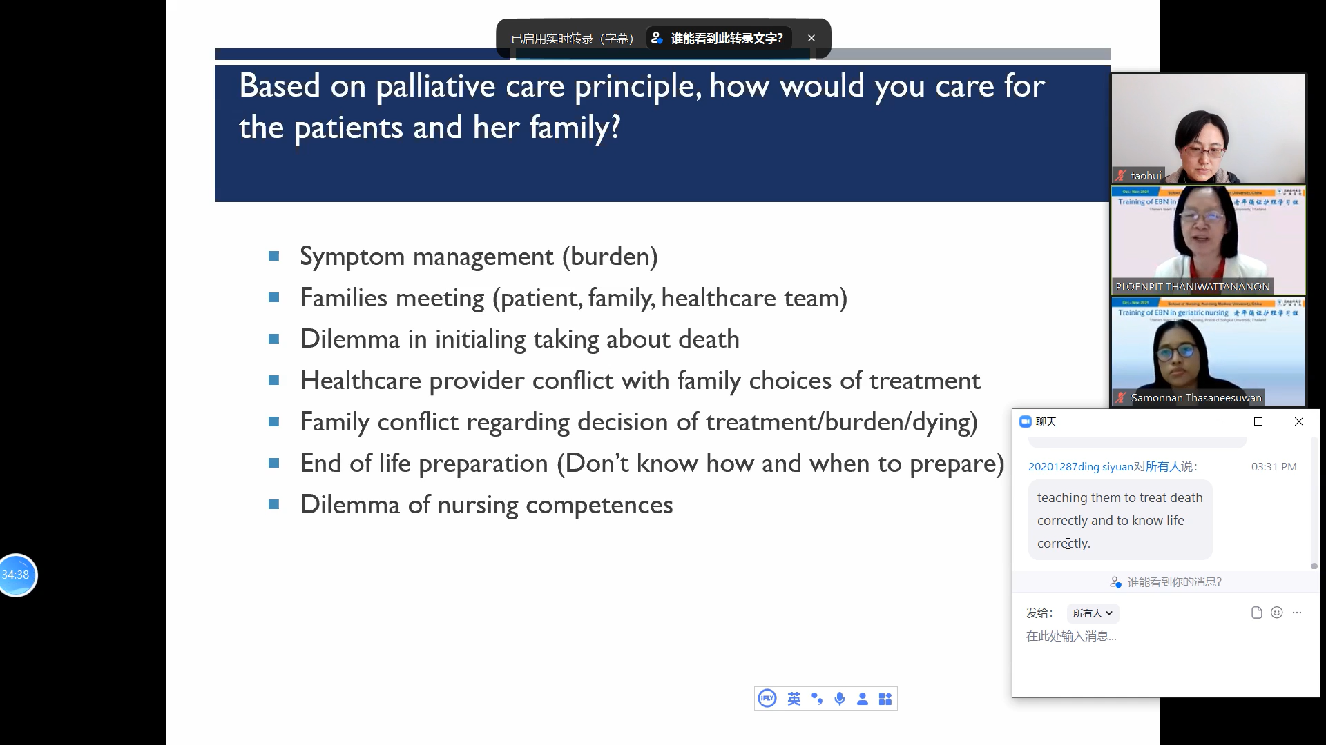 通过聆听泰国护理专家对于老年护理领域的循证护理实践、泰国老年护理体系与循证护理实践、老年综合评估、老年健康促进、老年睡眠促进、失智症长者护理、老年人安宁疗护、老年护理领域的循证护理研究与项目发展等专题的讲授,开拓了我院护理研究生的国际视野,增强了他们运用循证护理的方法开展老年护理研究的能力,也了解到泰国新冠疫情防控背景下老年循证护理实践中的科研创新与值得借鉴的做法。